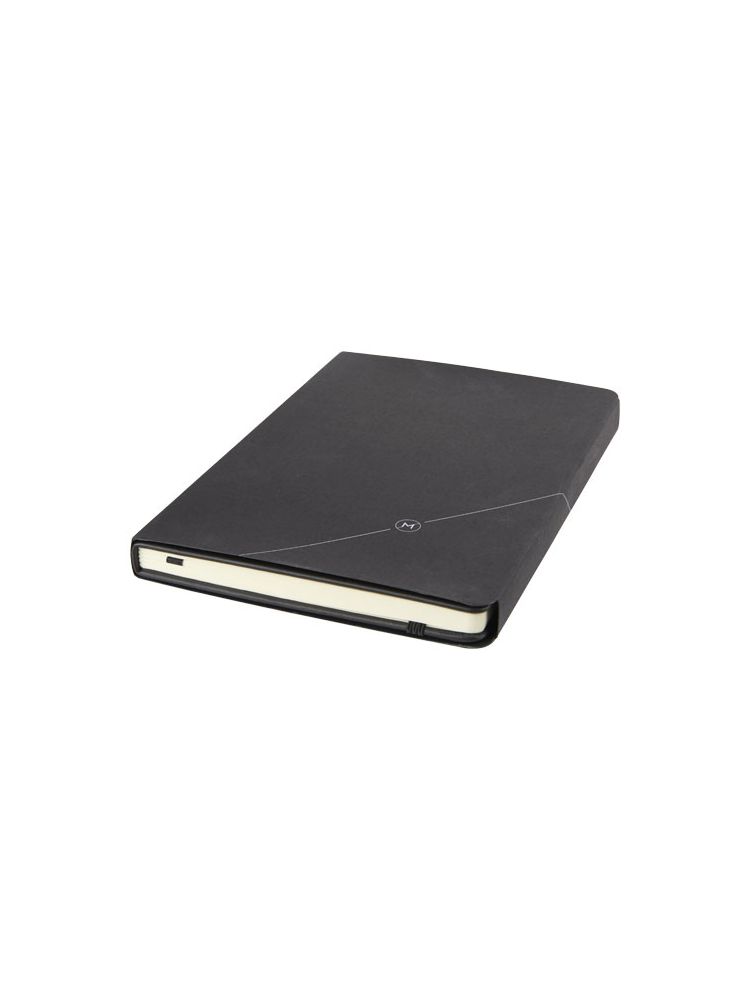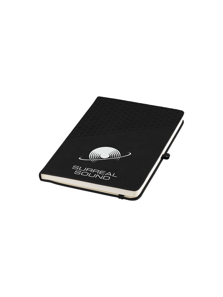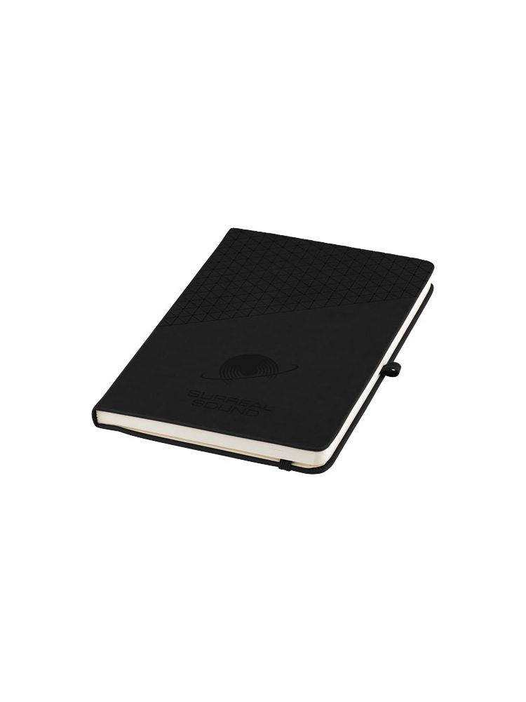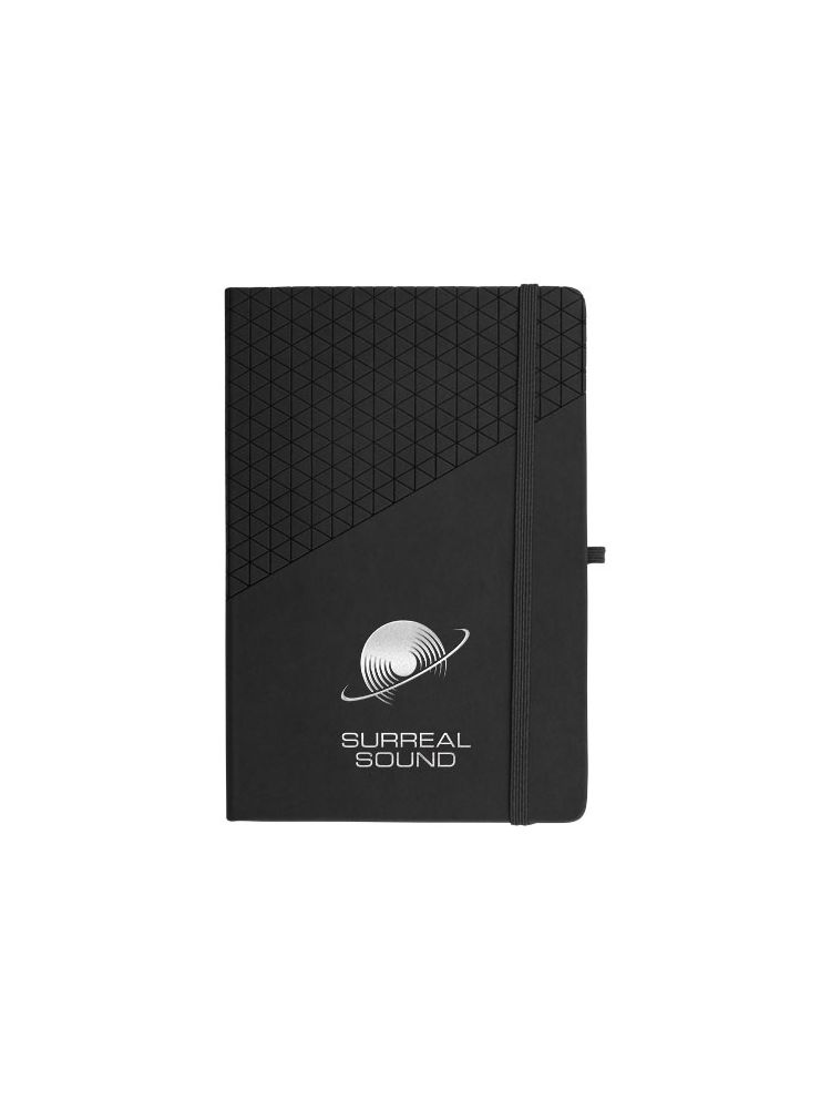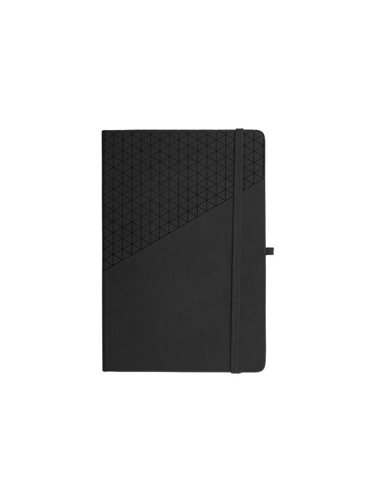 Delikatny w dotyku notes A5 z geometrycznym wzorem. Zawiera 80 kartek (80 gsm) papieru w linie, wstążkę, elastyczne zamknięcie i pętęlkę na długopis.