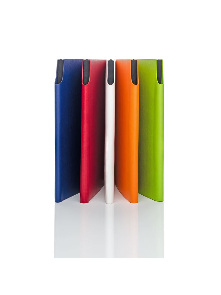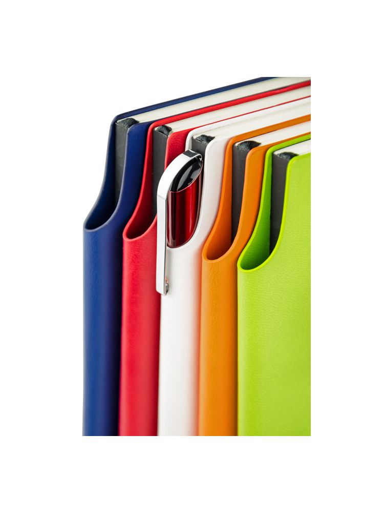 Notes formatu A5 w żywych, modnych kolorach. Notes zawiera 96 kartek w linie oraz praktyczną zakładkę – wstążeczkę. Okładka notesu wykonana z miękkiej ekoskóry, nieusztywniana. Wewnątrz grzbietu notesu ciekawie zaprojektowane miejsce na długopis.