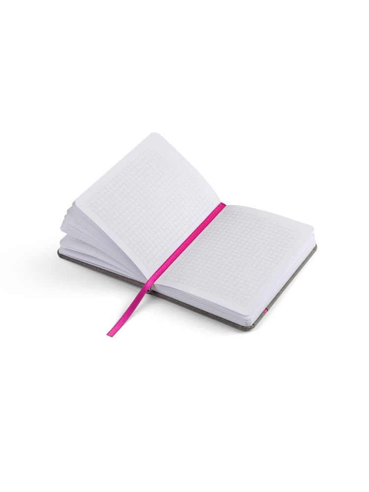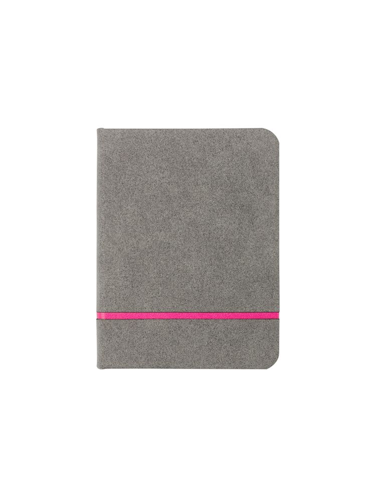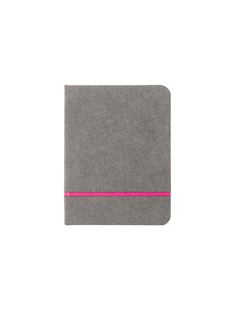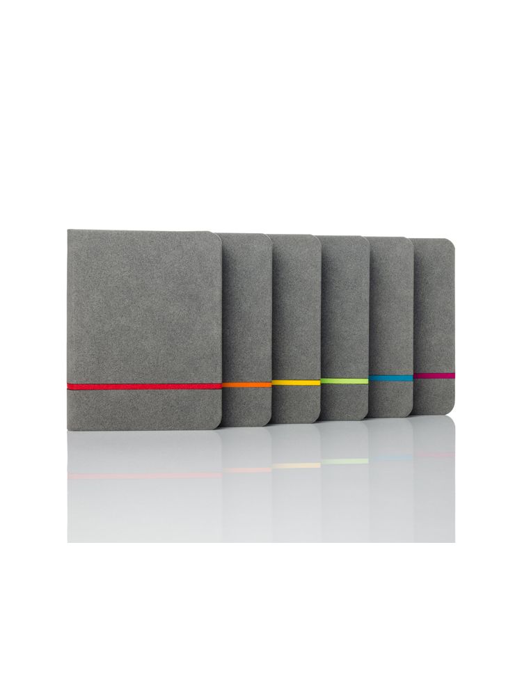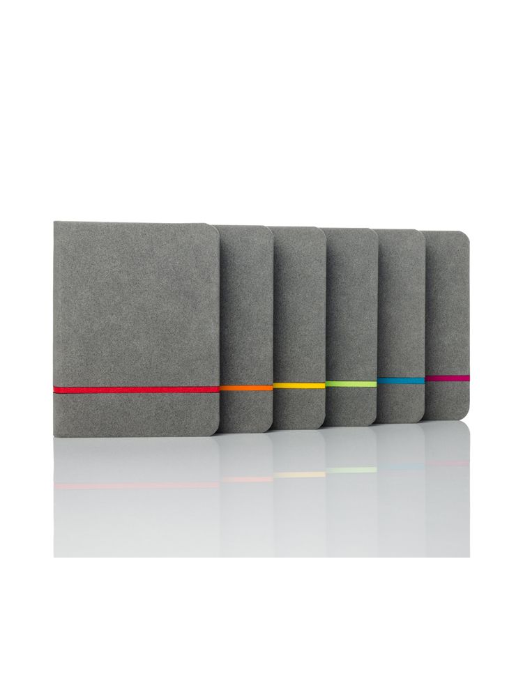 Wyjątkowy notes formatu A6 wyprodukowany w Unii Europejskiej z innowacyjnego materiału – papieru z kamienia. Do produkcji tego papieru nie używa się drewna, celulozy, ani wody, dlatego wytworzenie go jest w 100% ekologiczne. Papier z kamienia jest wyjątkowo odporny na rozdarcia oraz na działanie wilgoci, ulega szybkiej biodegradacji, jest miękki w dotyku i dodatkowo zużywa o 30% mniej tuszu (atramentu). Notes w okładce wykonanej z ekoskóry imitującej zamsz w modnym połączeniu kolorystycznym – szare tło z cienkim paskiem w żywych kolorach. Zakładka – wstążeczka dopasowana kolorystycznie do kolorowego paska na okładce. Posiada 74 kartki w kratkę.