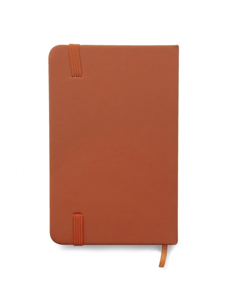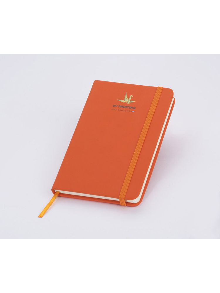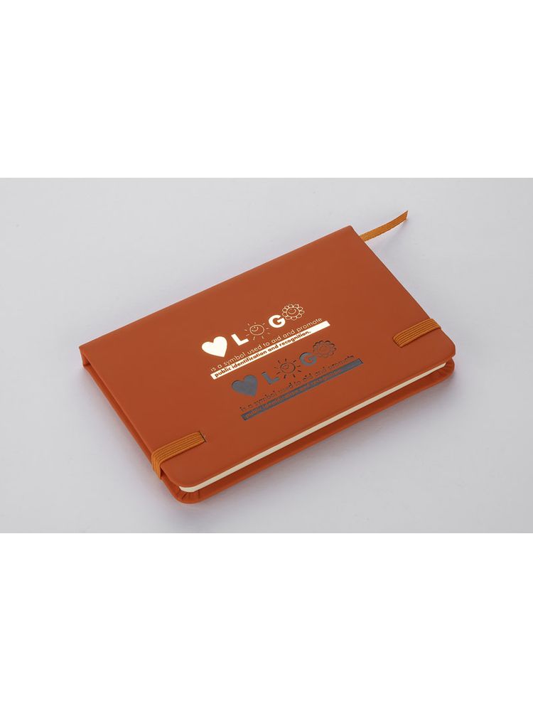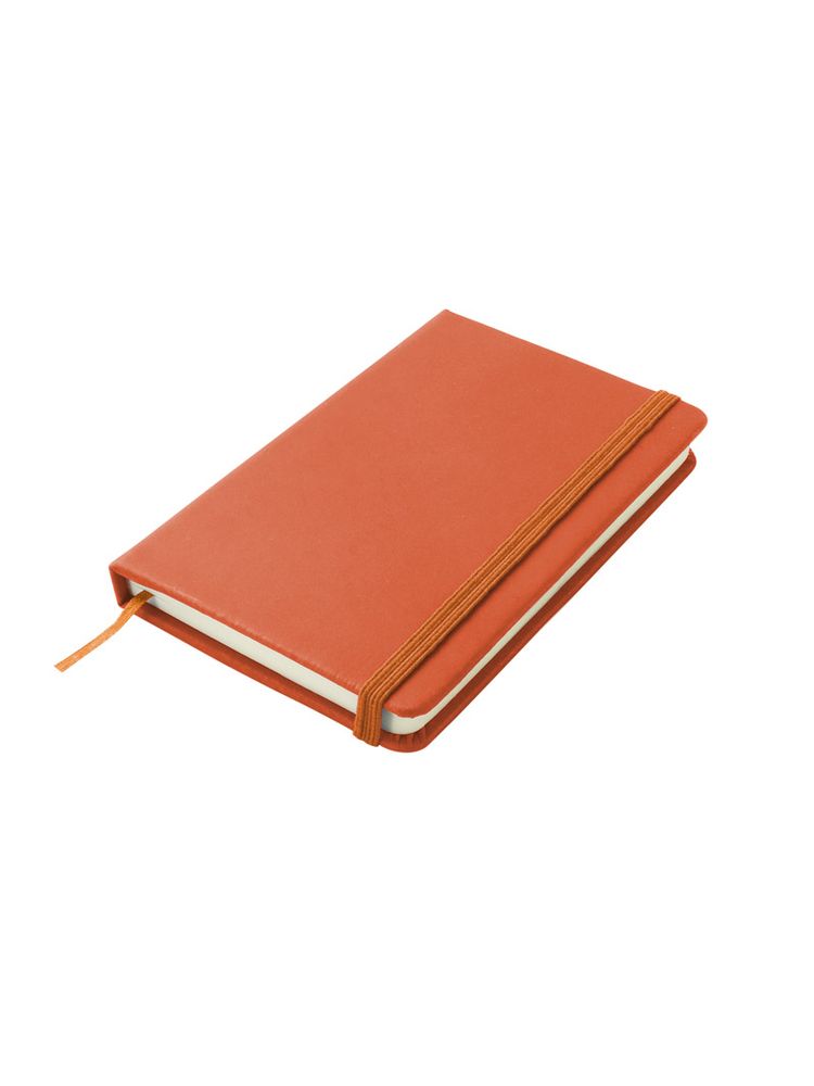 Gustowny notes A6 z kolorową gumką wykonany z ekoskóry PU. Notes zawiera 80 kartek ecru w linie koloru pomarańczowego. Logo nadrukujemy na okładce.