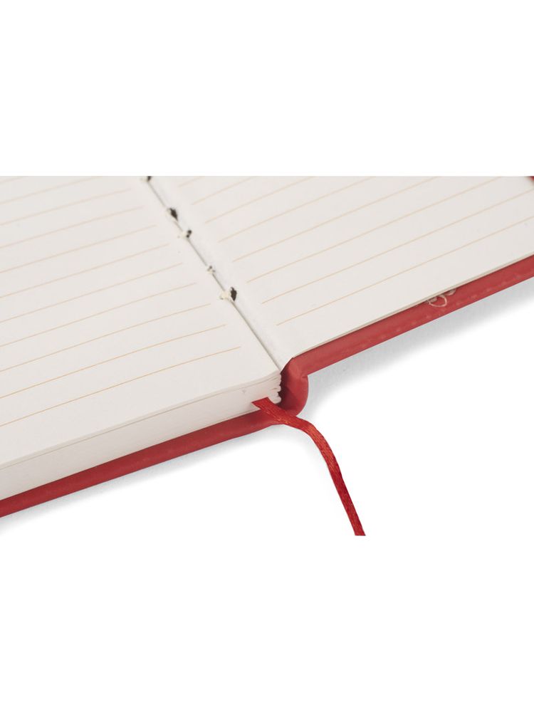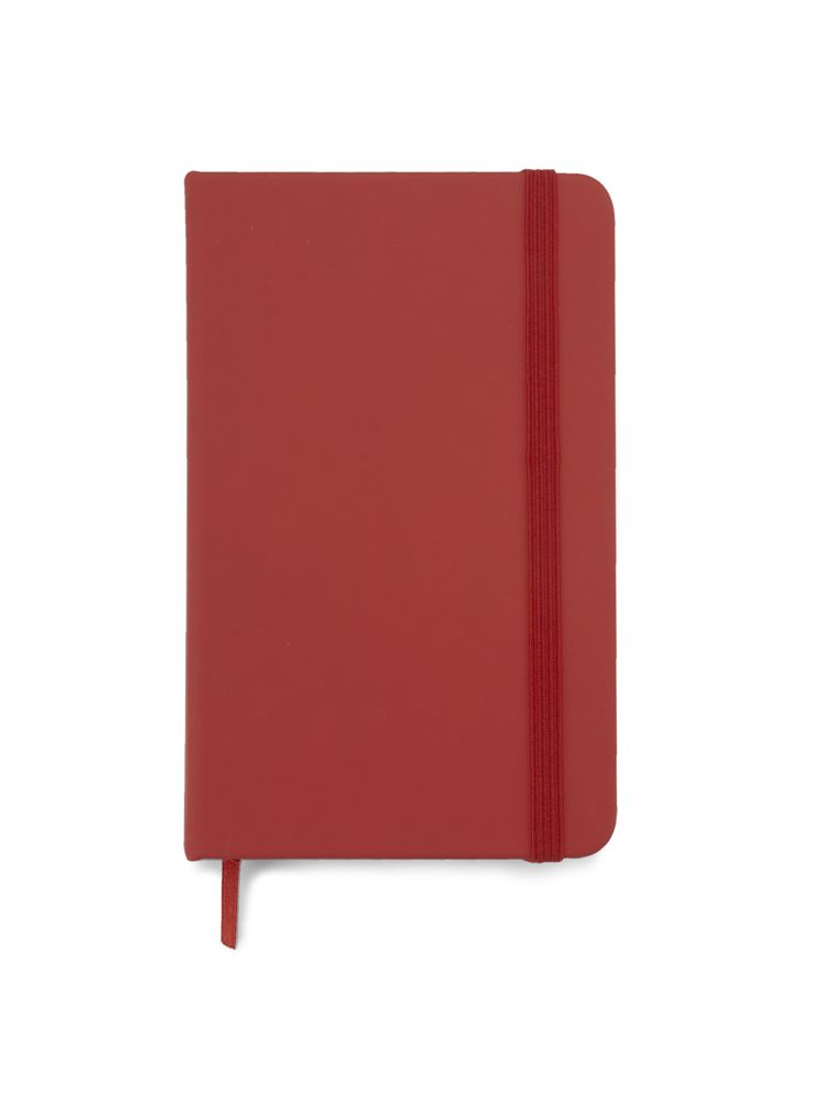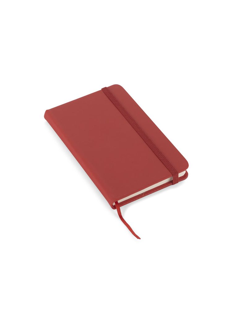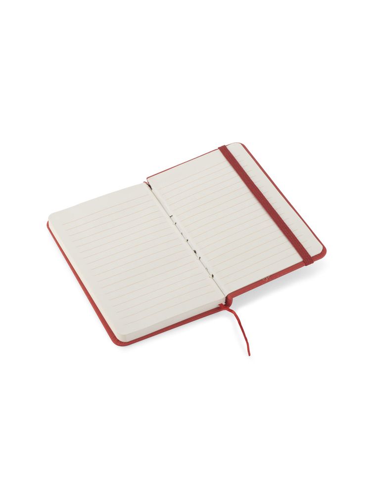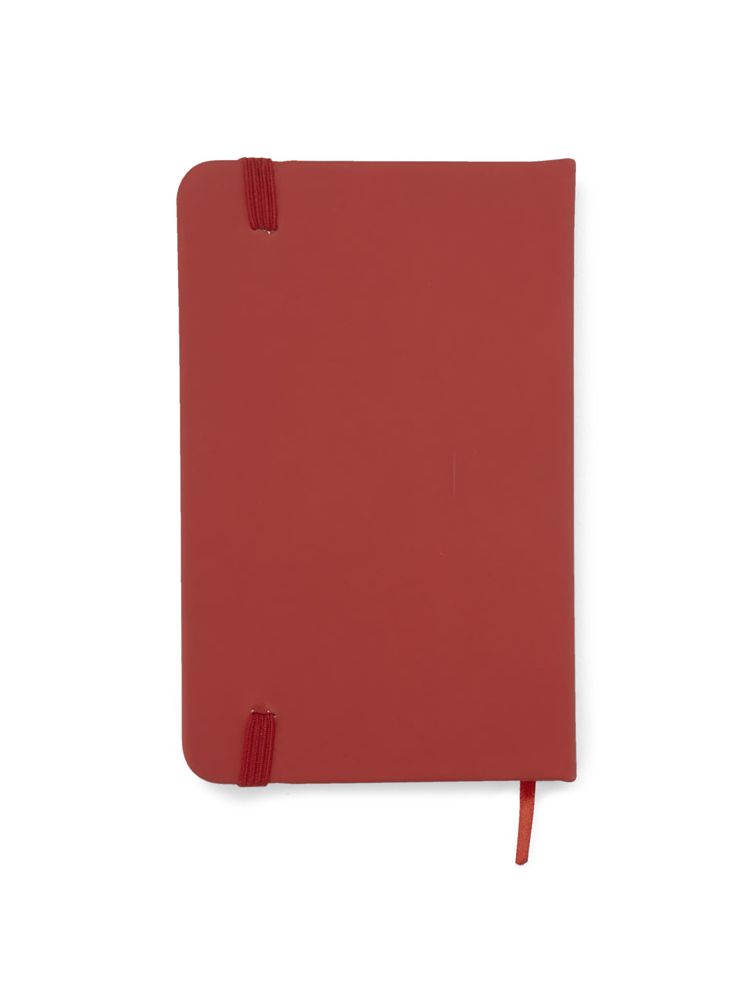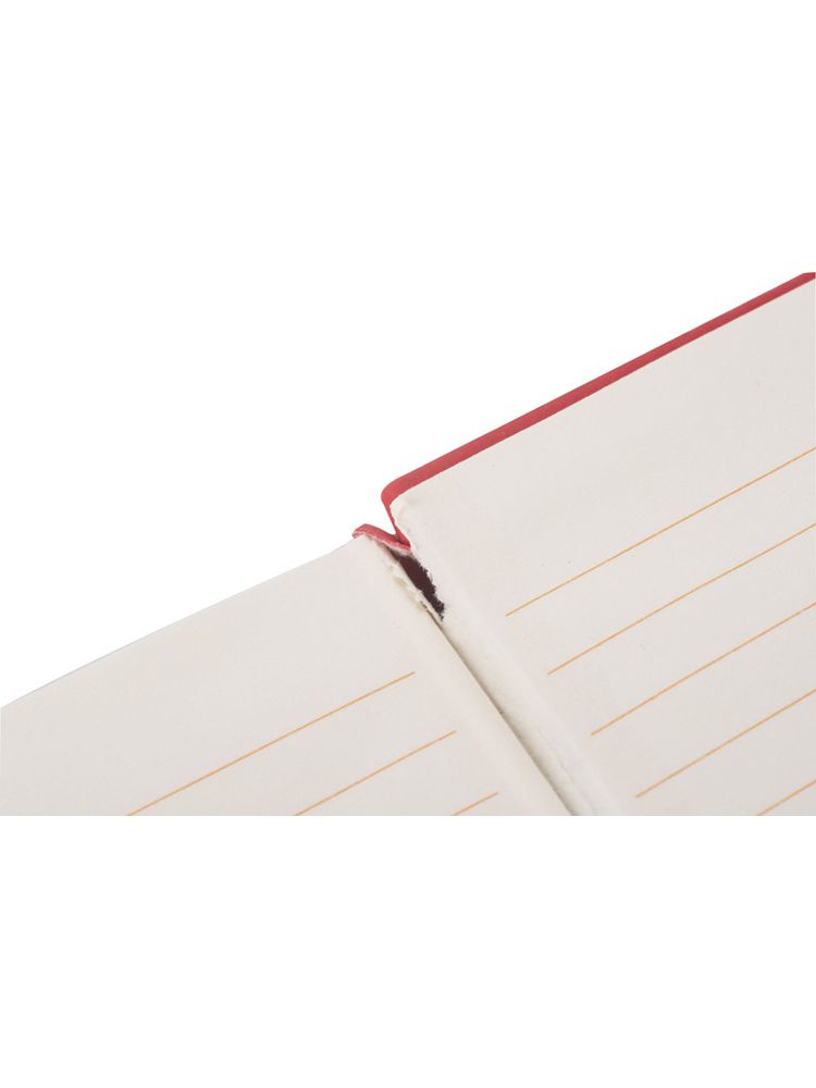 Gustowny notes A6 z kolorową gumką wykonany z ekoskóry PU. Notes zawiera 80 kartek ecru w linie koloru pomarańczowego. Logo nadrukujemy na okładce.