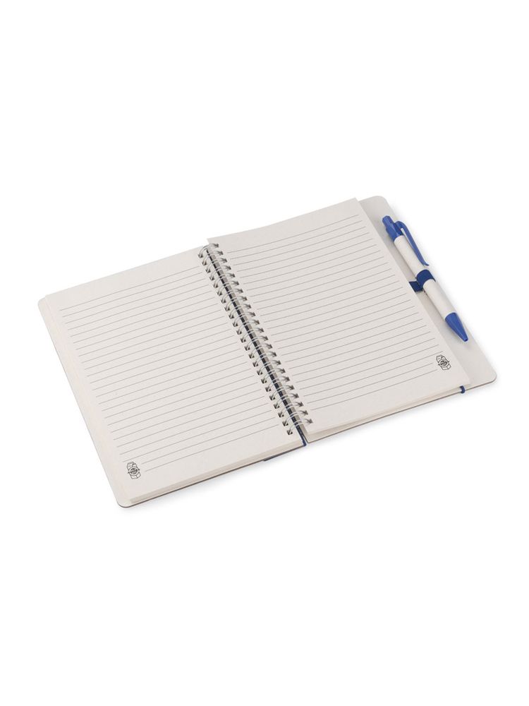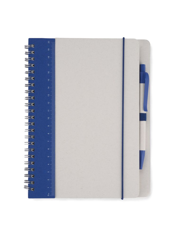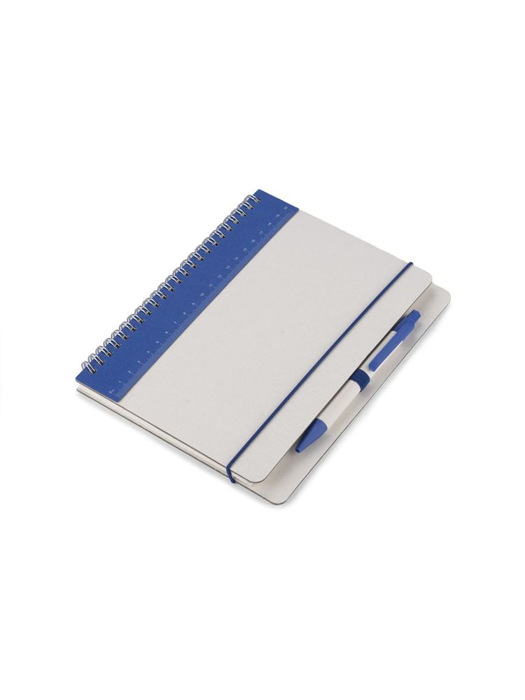 Notes REGALI wraz z długopisem wykonane są z kartonów po mleku. Długopis posiada wkład w kolorze niebieskim. Do notesu dołączona jest linijka o długości 20 cm pasująca kolorem do wykończeń na długopisie. Gumka na długopis oraz ta zamykająca notes w kolorystyce wykończeń długopisu.