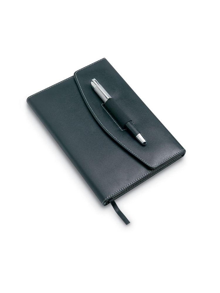 Notes A5 PU z kontrastowymi przeszyciami i długopisem. 240 stron w linie (120 kartek). Dopasowany metalowy długopis. Czarny tusz.