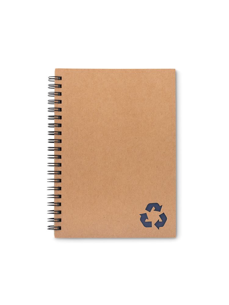 Notatnik z okładką z kartonu z recyklingu. Podwójna spirala. 140 stron w linie z papieru mineralnego (70 arkuszy). Papier mineralny jest wykonany z węglanu wapnia i HDPE (żywicy polietylenowej) stosowanej jako spoiwo. Jest wodoodporny i odporny na tłuszcz.