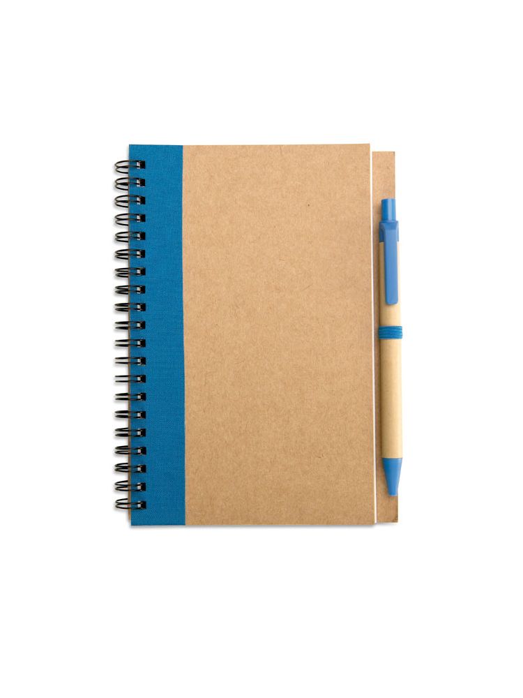 Notes B6 z papieru z recyklingu z dopasowanym długopisem. Podwójna spirala. 140 czystych stron z papieru z recyklingu (70 kartek). Dopasowany długopis z kartonu z recyklingu i biodegradowalnego plastiku. Niebieski tusz. Dopasowany elastyczny uchwyt na długopis.