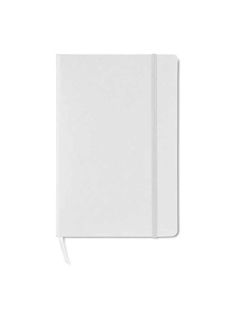 Notatnik A5 z twardą okładką z PVC. 192 strony w kratkę z papieru z recyklingu (96 kartek). Dopasowany elastyczny pasek zamykający i zakładka ze wstążki.