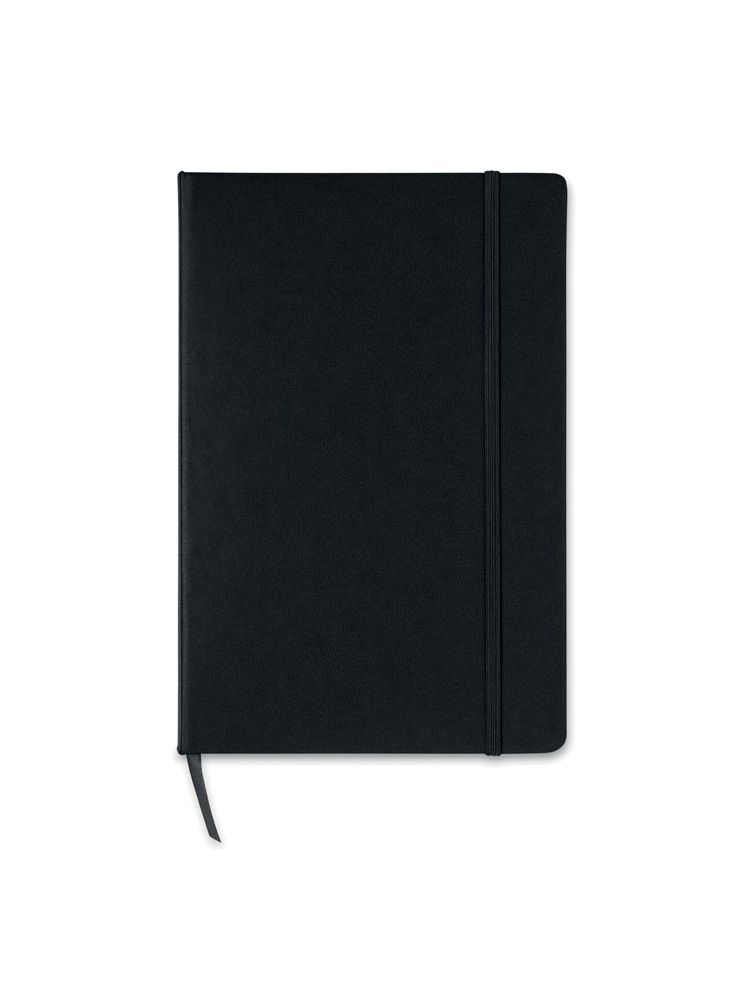Notatnik A5 z twardą okładką z PVC. 192 strony w kratkę z papieru z recyklingu (96 kartek). Dopasowany elastyczny pasek zamykający i zakładka ze wstążki.