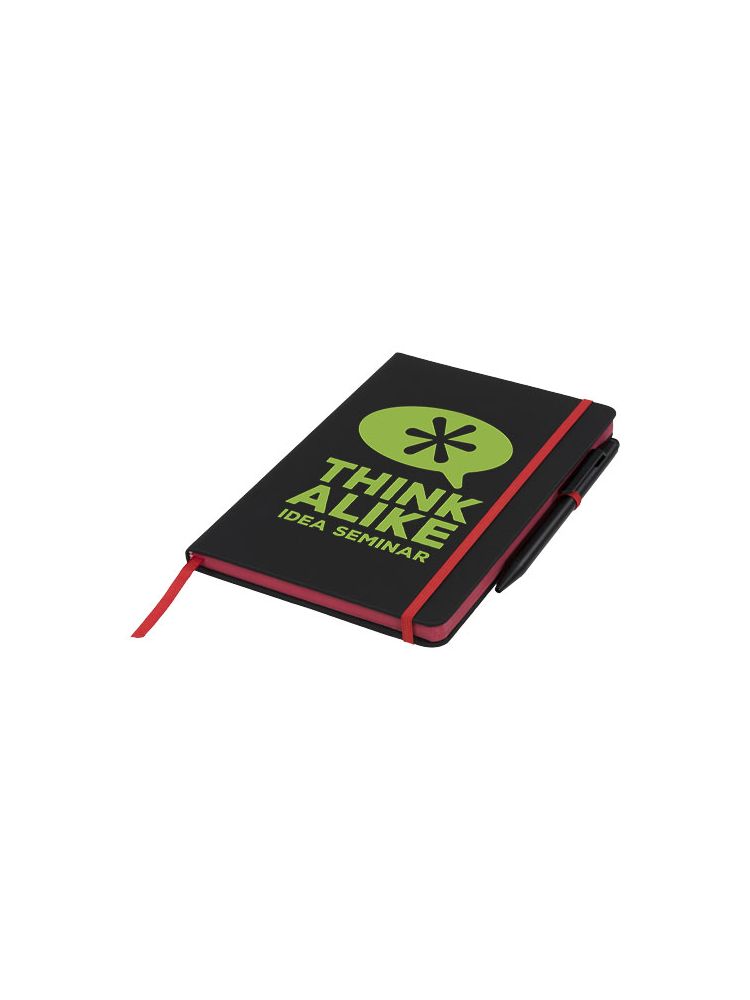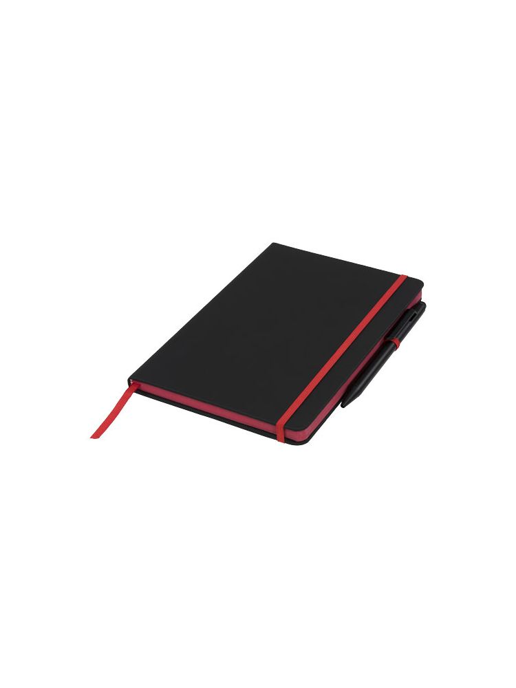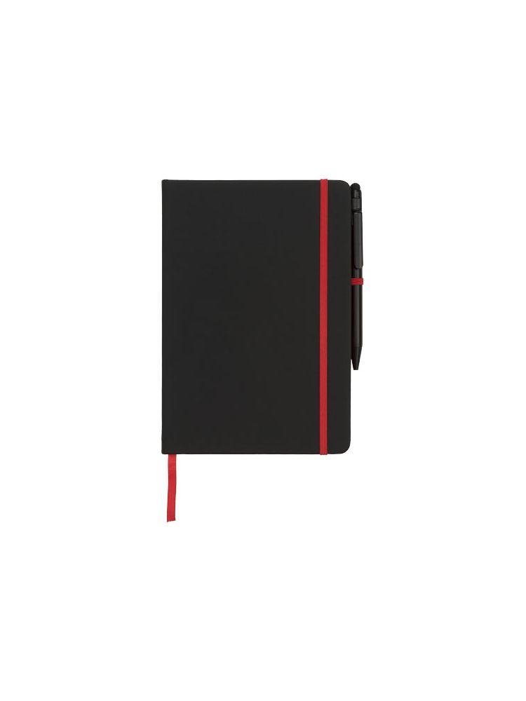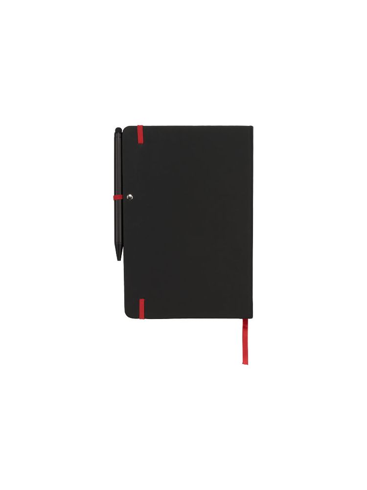 Nowoczesny i stylowy czarny notes z przyjemną w dotyku okładką. Ma kolorowe krawędzie. W zestawie pasujący kolorem marker, pętelka na długopis i pasek do zamykania notesu. W zestawie czarny długopis ze stylusem bez zdobień. 96 kremowych kartek w linie (gramatura 70 g/m²).