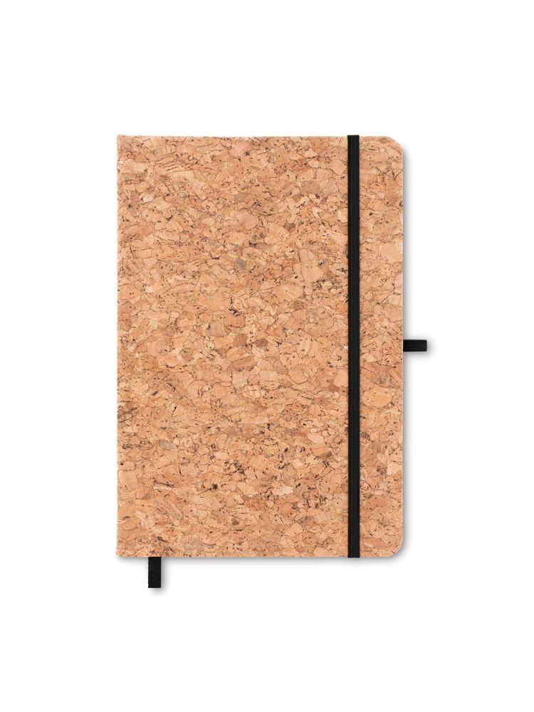 Notatnik A5 z twardą, korkową okładką. Oprawiony w pudełko. 192 kartki w linie (96 arkuszy). Elastyczny pasek zamykający, zakładka ze wstążki i elastyczny uchwyt na długopis.
