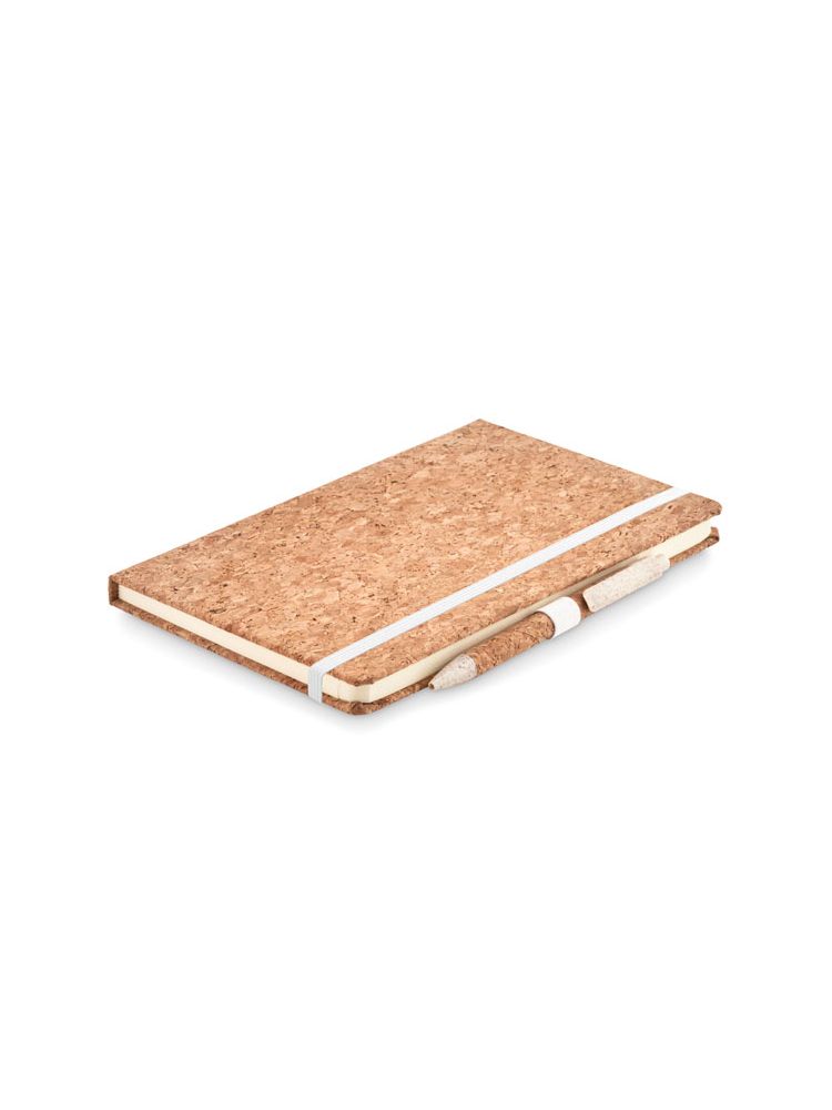 Notes korkowy A5 z dopasowanym długopisem. Twarda korkowa okładka. 160 stron w linie (80 kartek) z papieru z recyklingu. Elastyczny pasek zamykający i uchwyt na długopis. Dopasowany długopis z korkowym korpusem i detalami wykonanymi w 50% ze słomy pszenicznej i 50% z PP. Pakowany w pudełko upominkowe. Korek jest materiałem w 100% naturalnym. Ze względu na jego strukturę i porowatość powierzchni ostateczny wygląd nadruku na każdym artykule może się różnić.