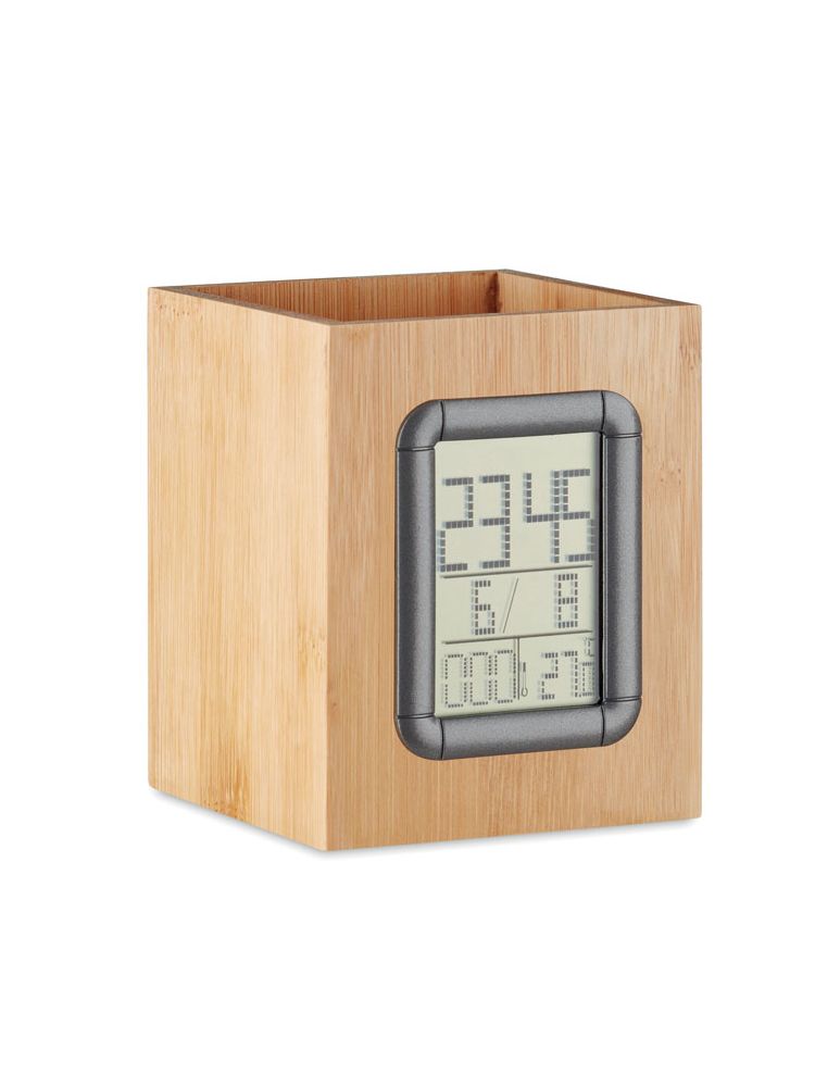 Bambusowy pojemnik na długopisy z kalendarzem, budzikiem i termometrem. Dołączone 2 baterie. Bambus jest produktem naturalnym, dlatego mogą wystąpić nieznaczne różnice w kolorze, wzorze i rozmiarze.