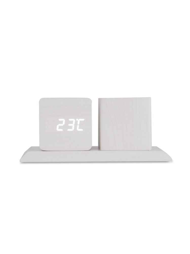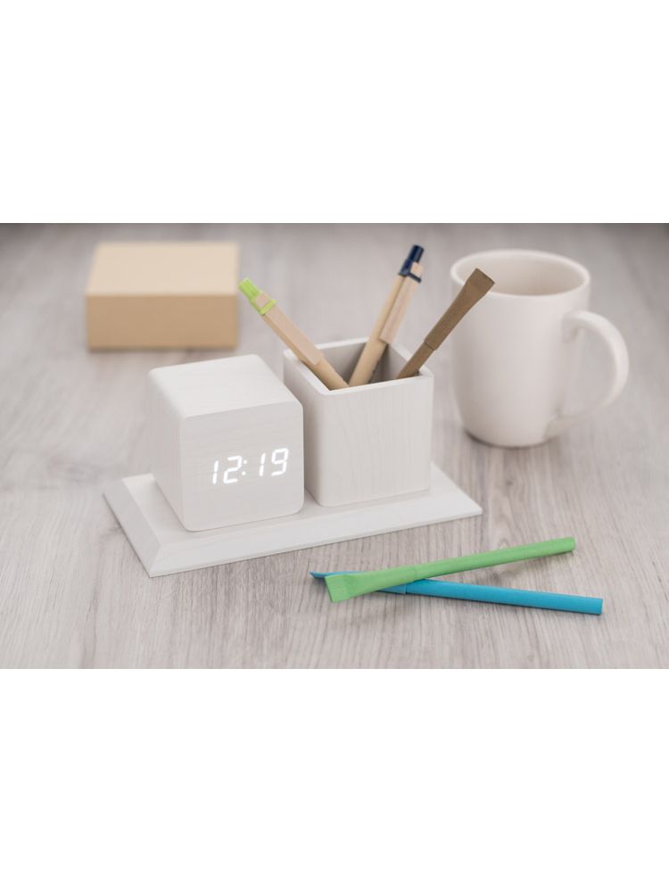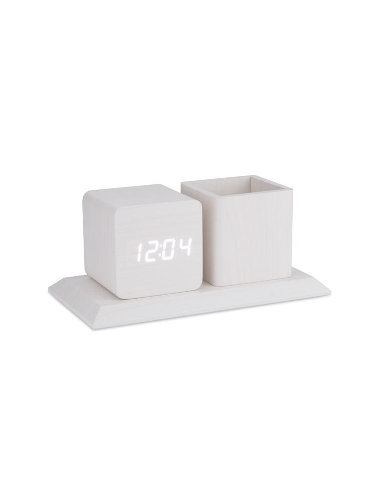 Organizer na biurko wykonany z płyty MDF o modnym wykończeniu w kolorze jasnego drewna, który świetnie pasuje do nowoczesnych pomieszczeń. Posiada pojemnik na długopisy oraz zegar z funkcjami: kalendarza, alarmu oraz termometru.