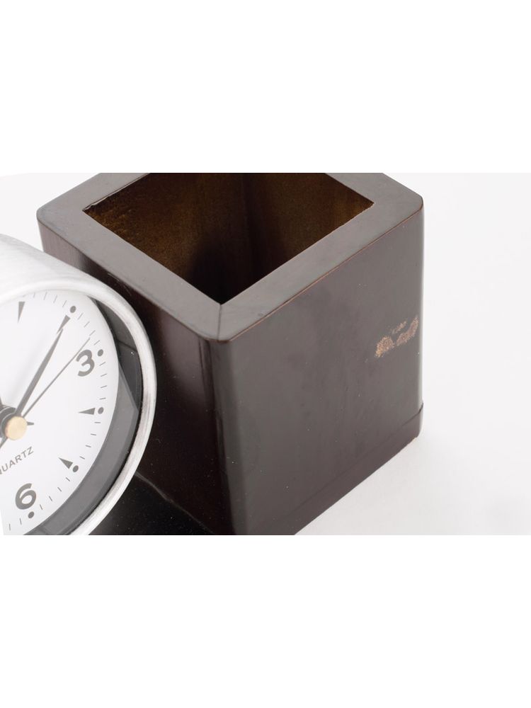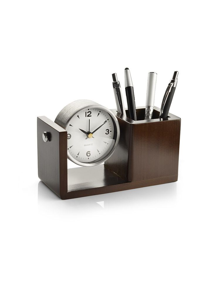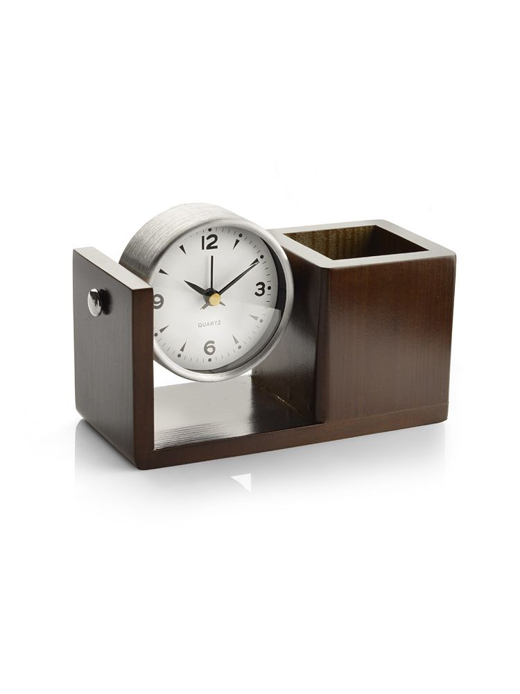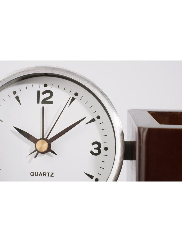Metalowy zegar z budzikiem i dużą białą tarczą jest zamocowany na eleganckiej drewnianej podstawce z litego drewna. Zestaw jest wyposażony w pojemnik na artykuły biurowe. Zegar można obracać w górę i w dół. Zegar będzie cenioną ozdobą każdego biurka ze względu na połączenie estetyki z funkcjonalnością. Znakowanie możliwe na drewnianej części przeznaczonej na artykuły biurowe.
