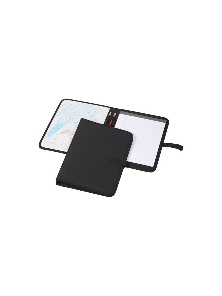 Portfolio A4 z zamknięciem na pętelkę i haczyk z tablicą suchościeralną i 30 kartkowym notatnikiem w linie. W zestawie markery i ściereczka.