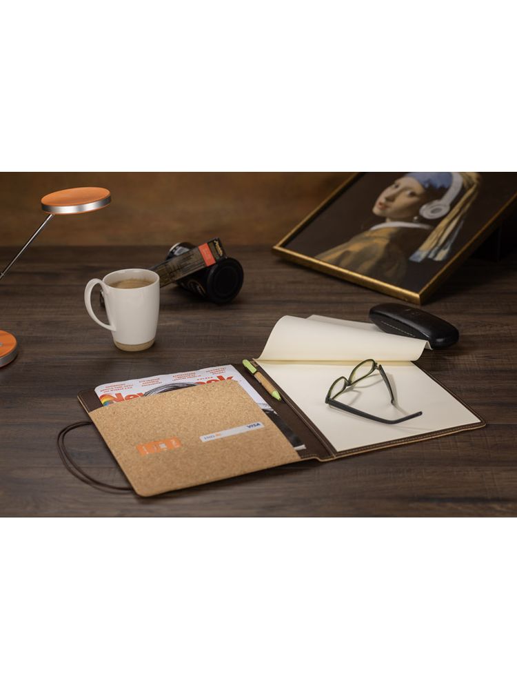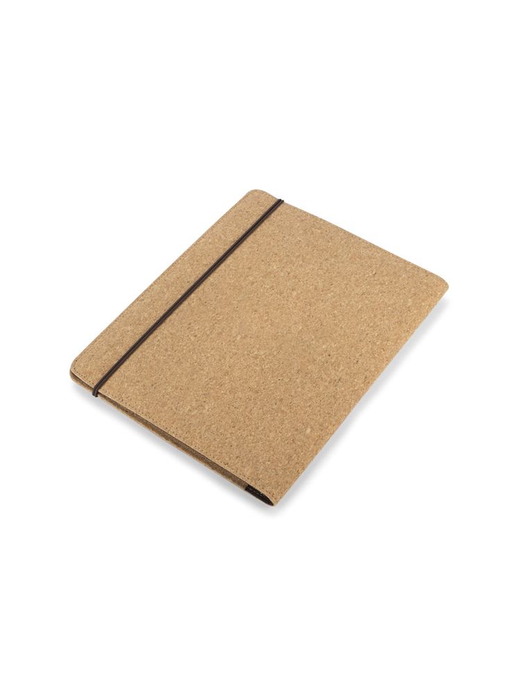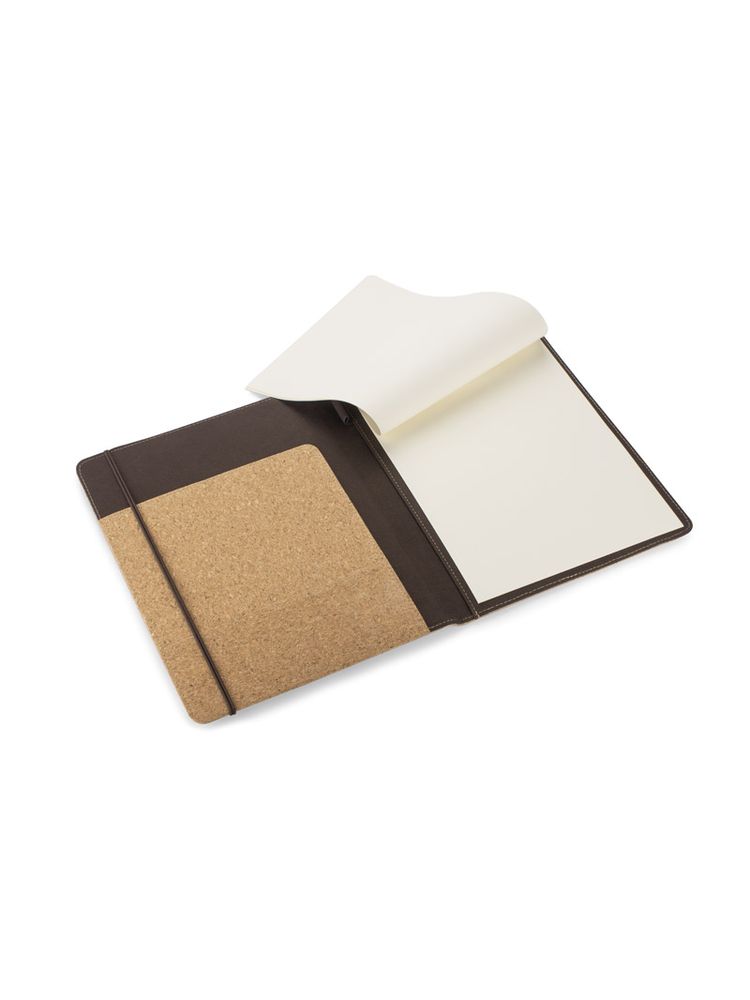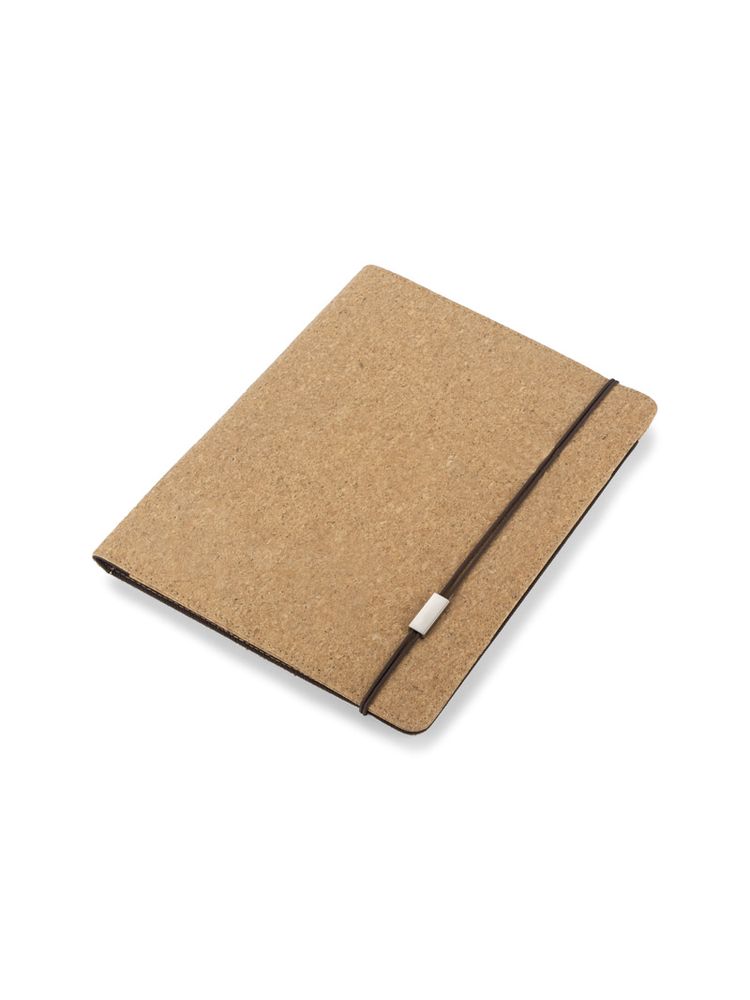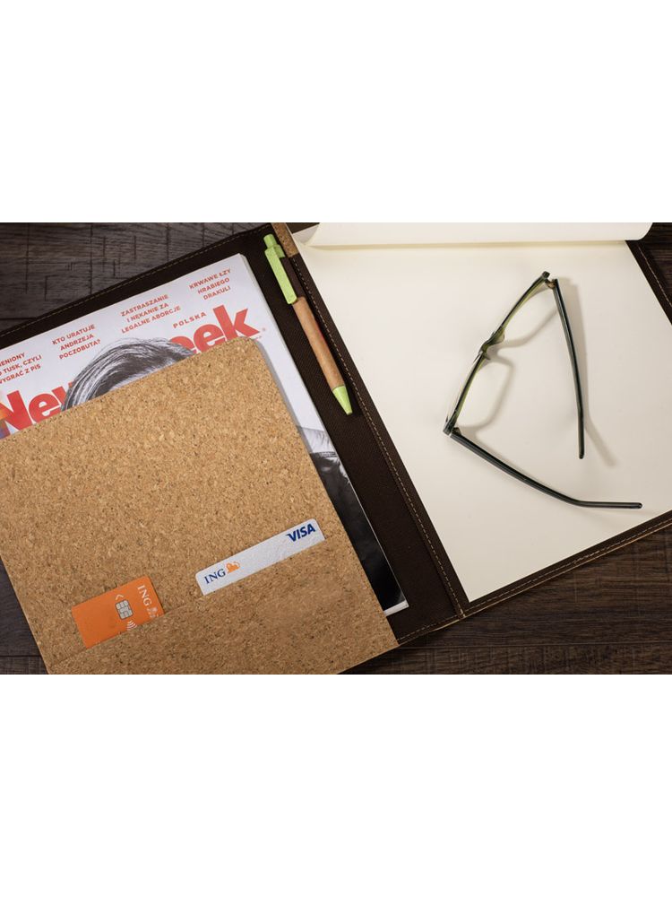 Korkowa teczka A4 z notatnikiem. Zawiera dużą kieszeń do przechowywania dokumentów, dwie mniejsze kieszonki oraz miejsce na długopis. Zamykana za pomocą gumki z metalowym elementem. Zapakowana w woreczek non woven.