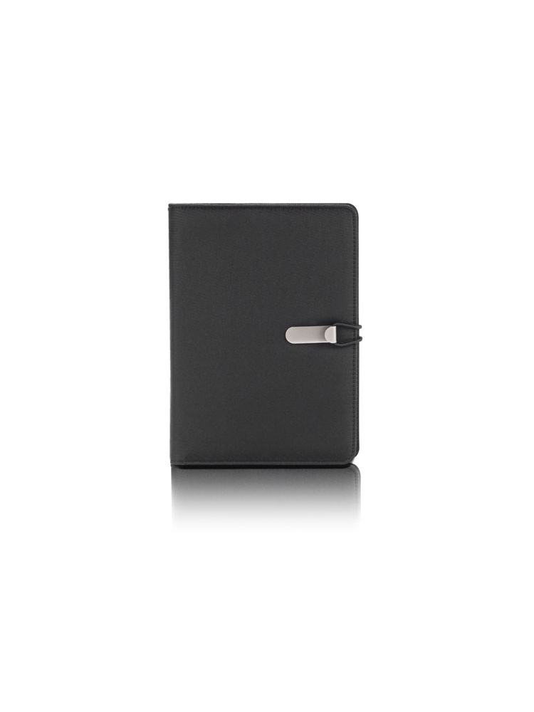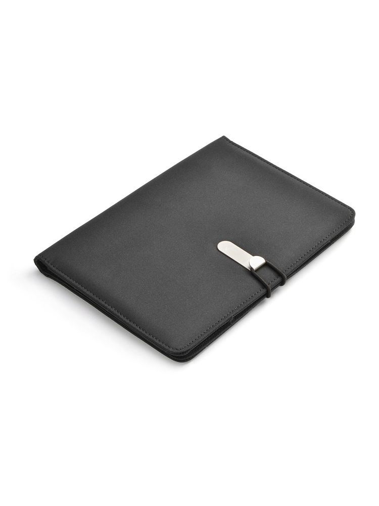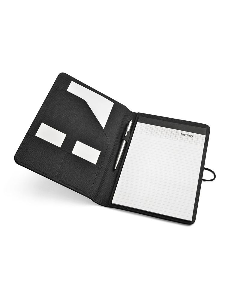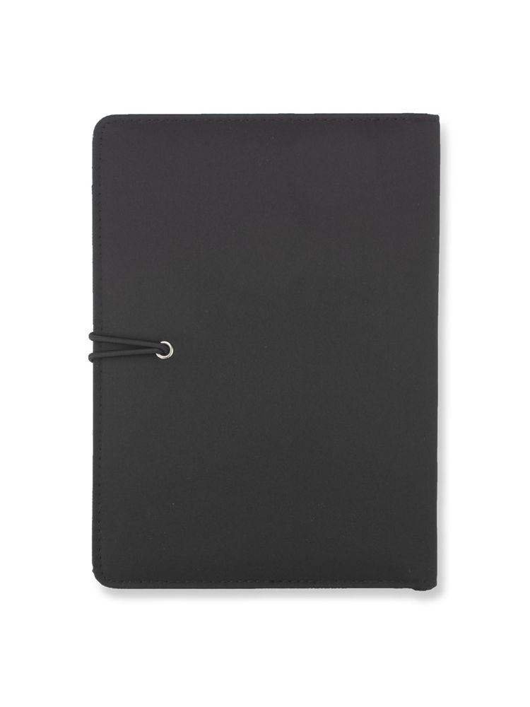 Prosta teczka o nowoczesnym wyglądzie. Zawiera dużą kieszeń, małe kieszonki, miejsce na długopis, notes. Teczka zapinana na gumkę zaczepianą o metalowy haczyk. Wykonana z mikrofibry i poliestru. Notes nie jest umocowany na stałe, ale wsuwany w kieszonkę, dzięki czemu można go łatwo wymienić. Logo wygrawerujemy na metalowym haczyku.