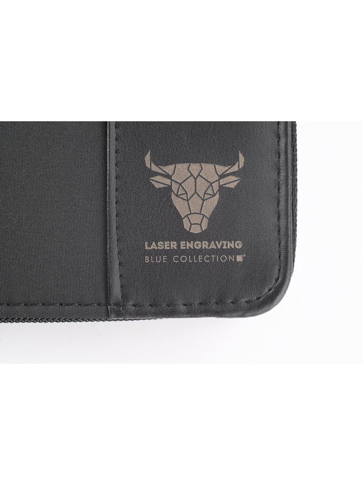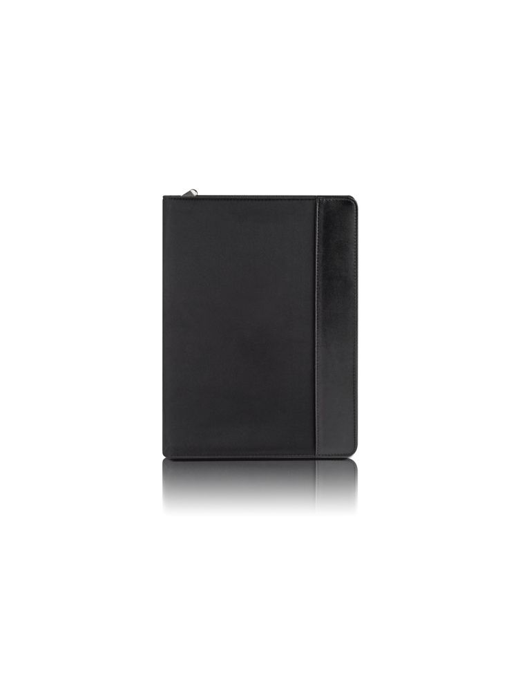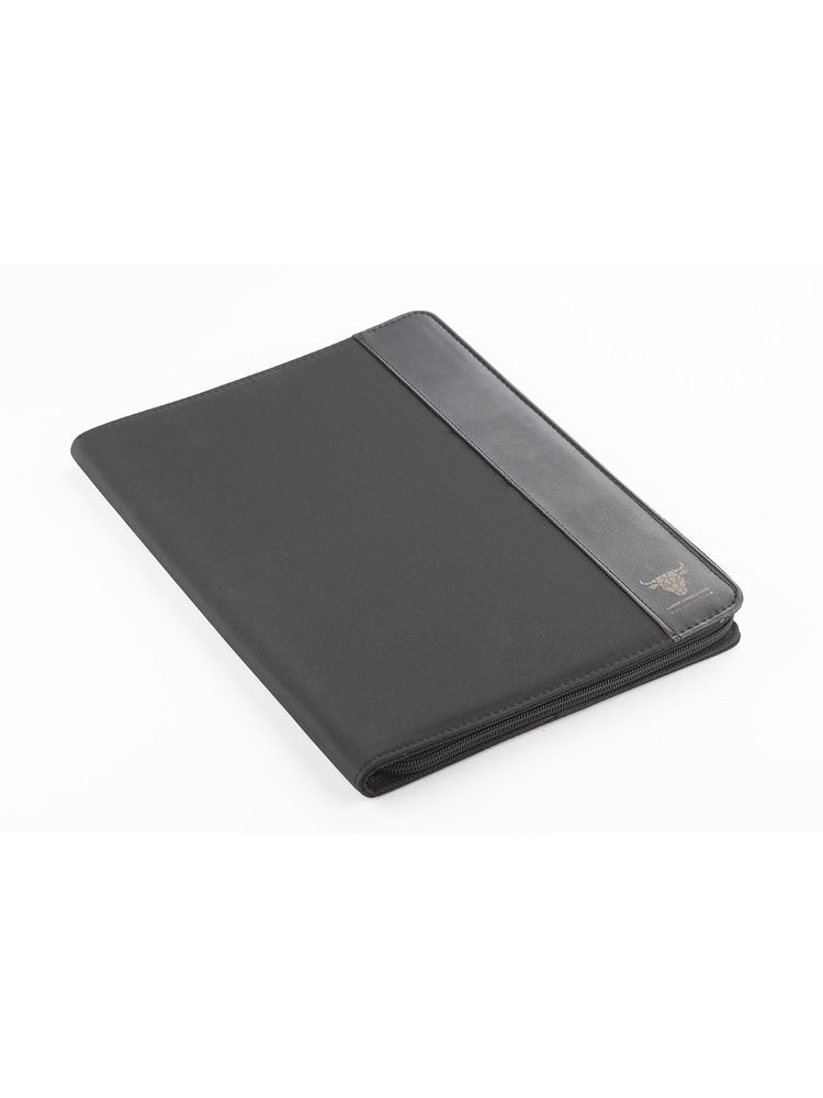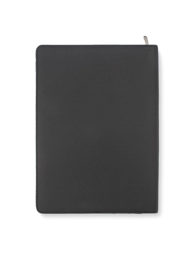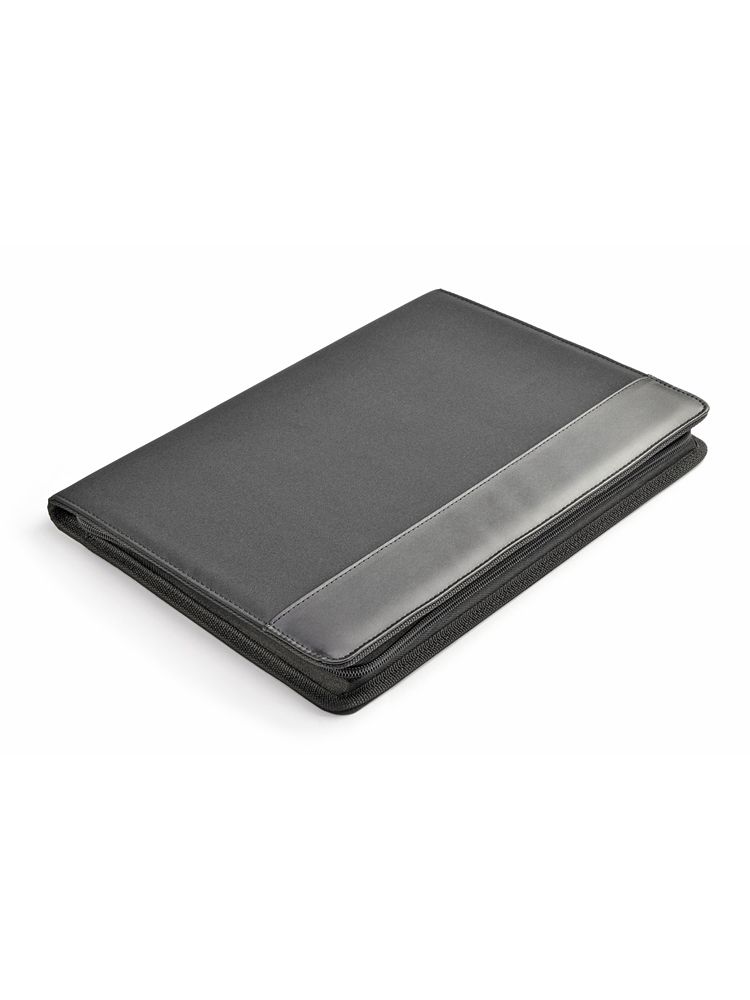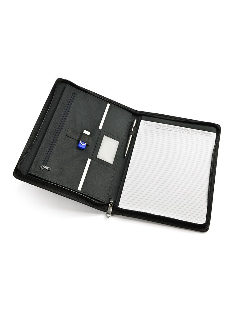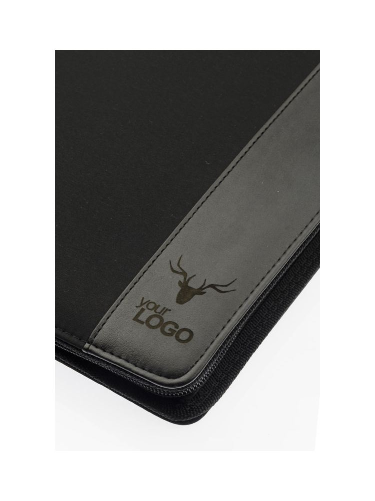 Teczka zapinana na zamek, wykonana z mikrofibry i poliestru 600D. Zawiera dużą kieszeń, kieszeń zapinaną na zamek, 2 miejsca do wpięcia USB, małe kieszonki, miejsce na długopis, notes. Notes nie jest umocowany na stałe, ale wsuwany w kieszonkę, dzięki czemu można go łatwo wymienić. Logo wygrawerujemy na teczce.