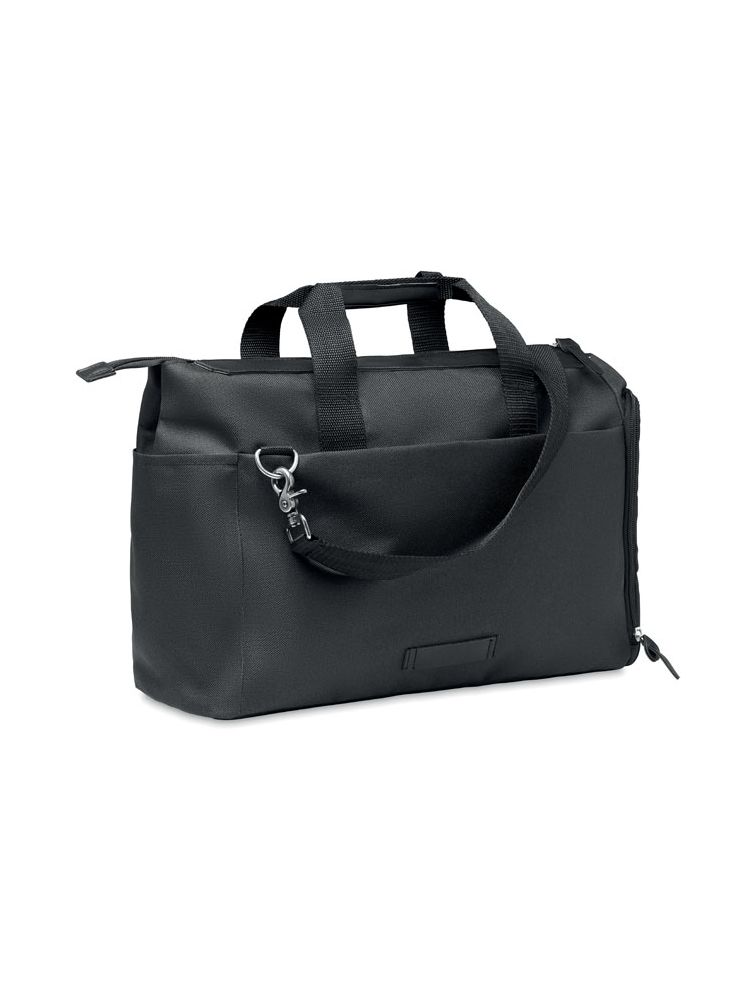 600D 2 ton RPET torba kurierska z kilkoma kieszeniami zapinanymi na zamek błyskawiczny i wyściełaną przegrodą na laptopa 15 cali. Regulowany i odpinany pasek na ramię.