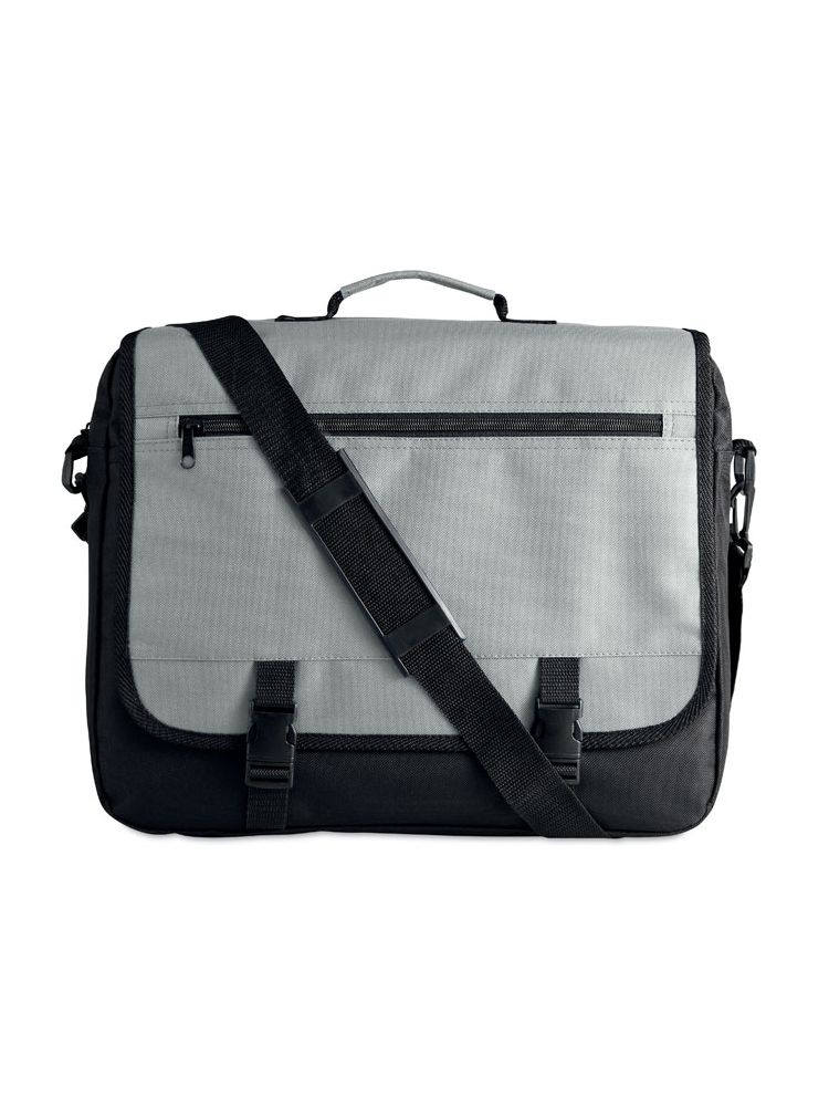 Torba na dokumenty z przednią kieszenią zamykaną na zamek oraz 2 klamry. Wykonana z poliestru 600D. Odpinany i regulowany pasek na ramię.