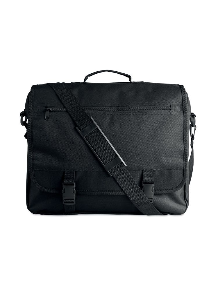 Torba na dokumenty z przednią kieszenią zamykaną na zamek oraz 2 klamry. Wykonana z poliestru 600D. Odpinany i regulowany pasek na ramię.