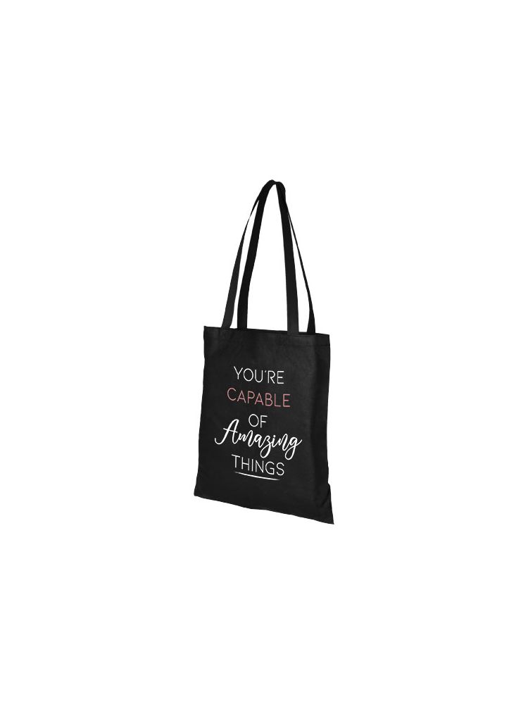 Potrzebujesz dobrej torby na każde targi lub konferencję? Duża torba z włókniny Zeus to doskonała opcja. Jej smukły design sprawia, że jest to model elegancki i odpowiedni do przenoszenia lekkich przedmiotów, takich jak notatnik i długopis. Rączki mają długość 29 cm, dzięki czemu można ją łatwo przewiesić przez ramię.