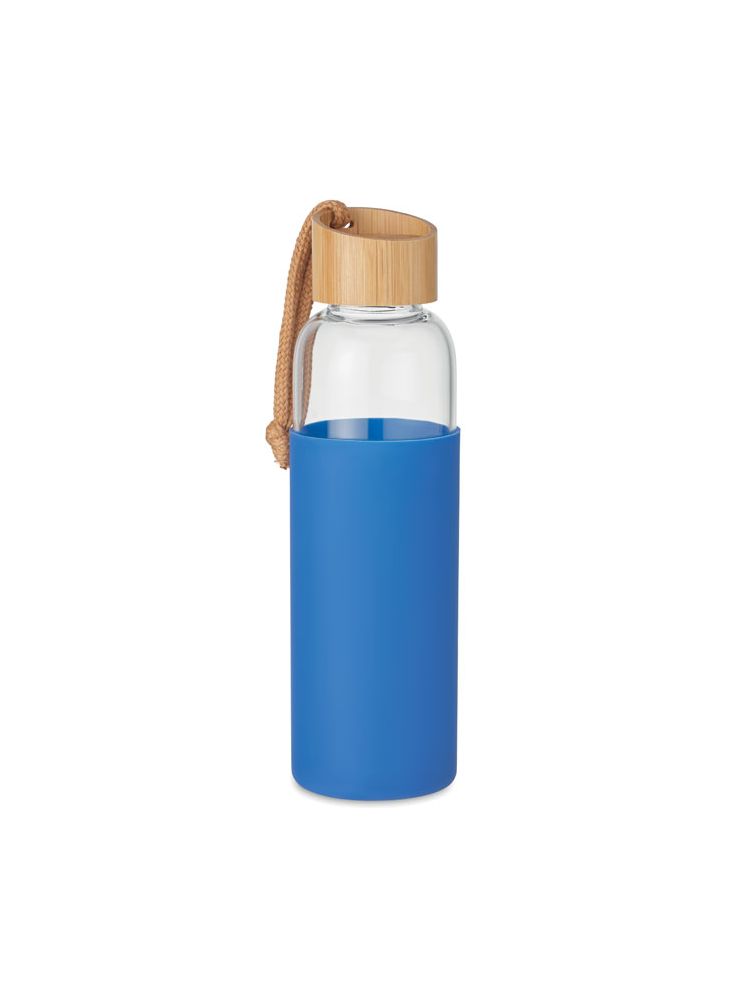 Szklana butelka w silikonowym etui i bambusową zakrętkąt, z bawełnianą pętęlką na nadgarstek. Nie nadaje się do napojów gazowanych. Nie przecieka. Pojemność: 500 ml. Bambus jest produktem naturalnym, dlatego mogą wystąpić nieznaczne różnice w kolorze, wzorze i rozmiarze.
