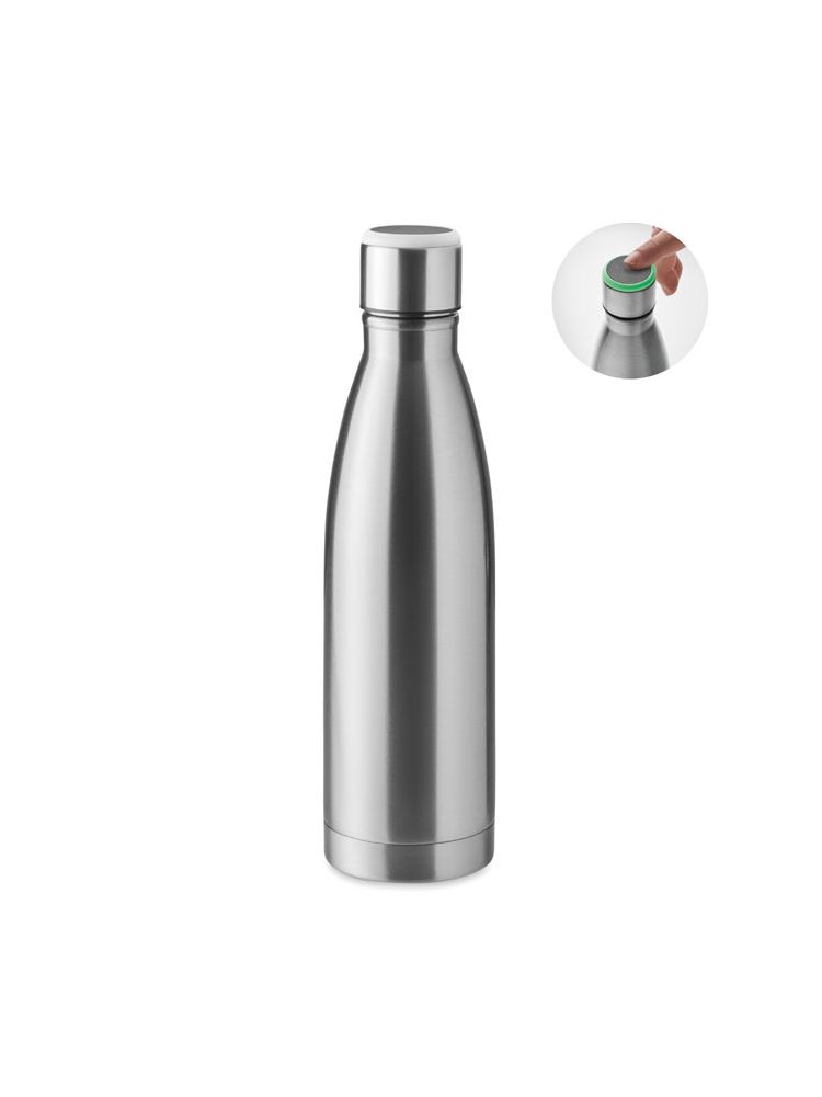 Dwuścienna butelka ze stali nierdzewnej z sensorem przypominającym. Światło czujnika świeci co godzinę przypominając o konieczności nawodnienia. Zawiera 1 baterię CR2032. Pojemność: 500 ml.