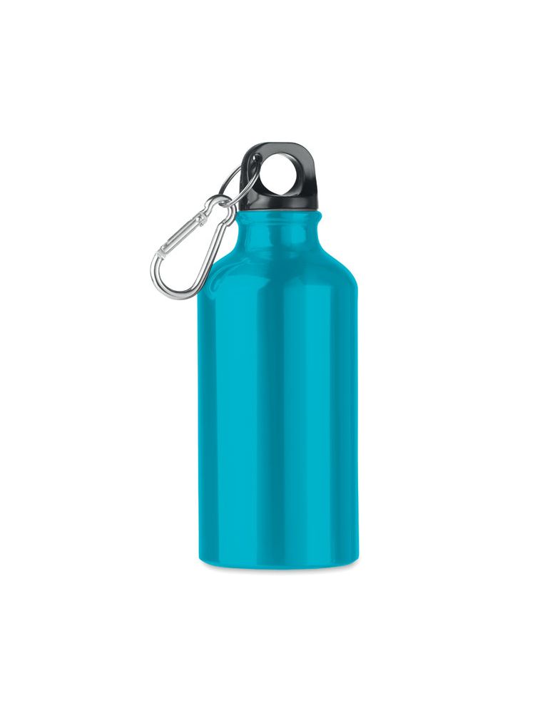 Aluminiowa butelka jednowarstwowa z karabińczykiem. 400 ml. Znakowanie sublimacją jest możliwe tylko na białych produktach. Szczelna.