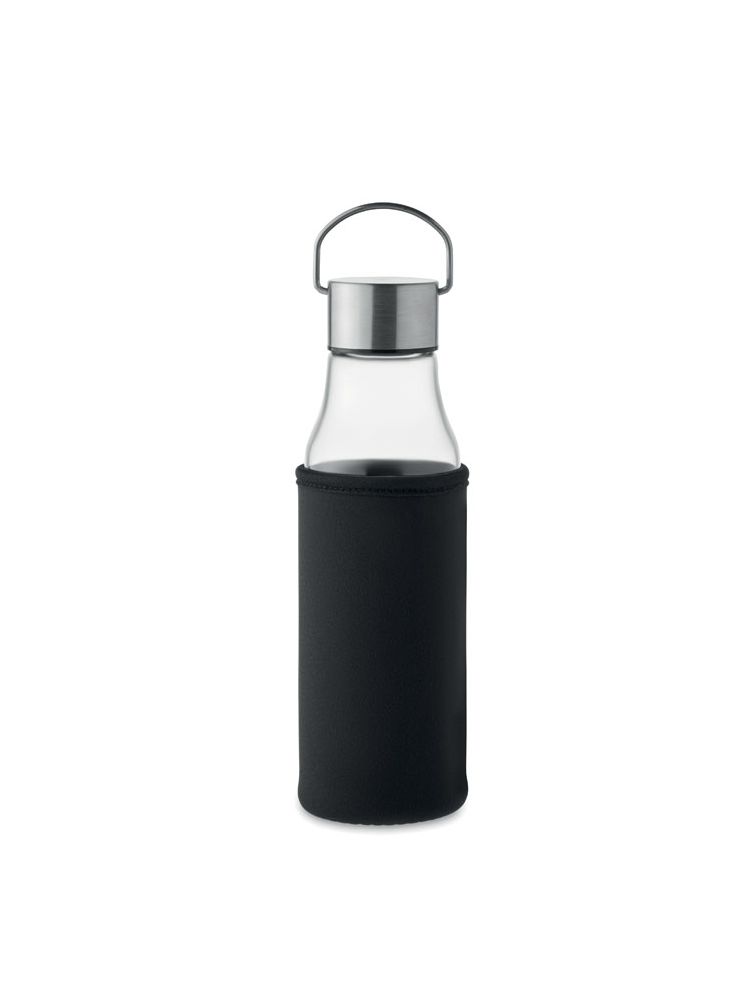 Szklana butelka z zakrętką z uchwytem ze stali nierdzewnej. Szczelna. Pojemność: 500 ml.