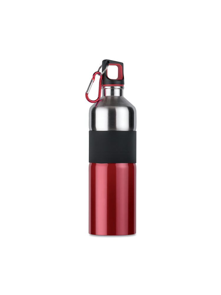 Dwukolorowa butelka do napojów ze stali nierdzewnej, z gumową opaską i karabinkiem. Pojemność: 750 ml. Karabinek nie jest przeznaczony do wspinaczki. Karabińczyk nie może służyć do wspinaczki (nie do profesjonalnego użycia). Szczelna.