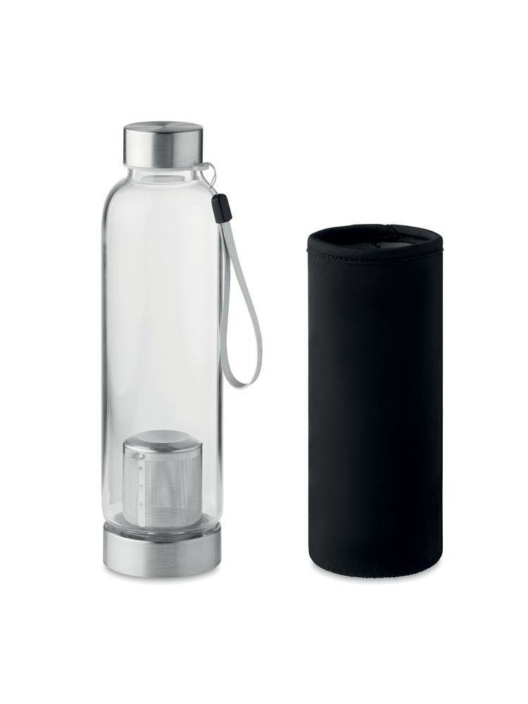 Wysokiej jakości szklana butelka ze szkła borokrzemianowego z zaparzaczem do herbaty i woreczkiem z neoprenu. Pojemność 500 ml. Nie nadaje się do napojów gazowanych. Szczelna. Grawerowanie laserowe nie jest możliwe na szkle borokrzemowym.