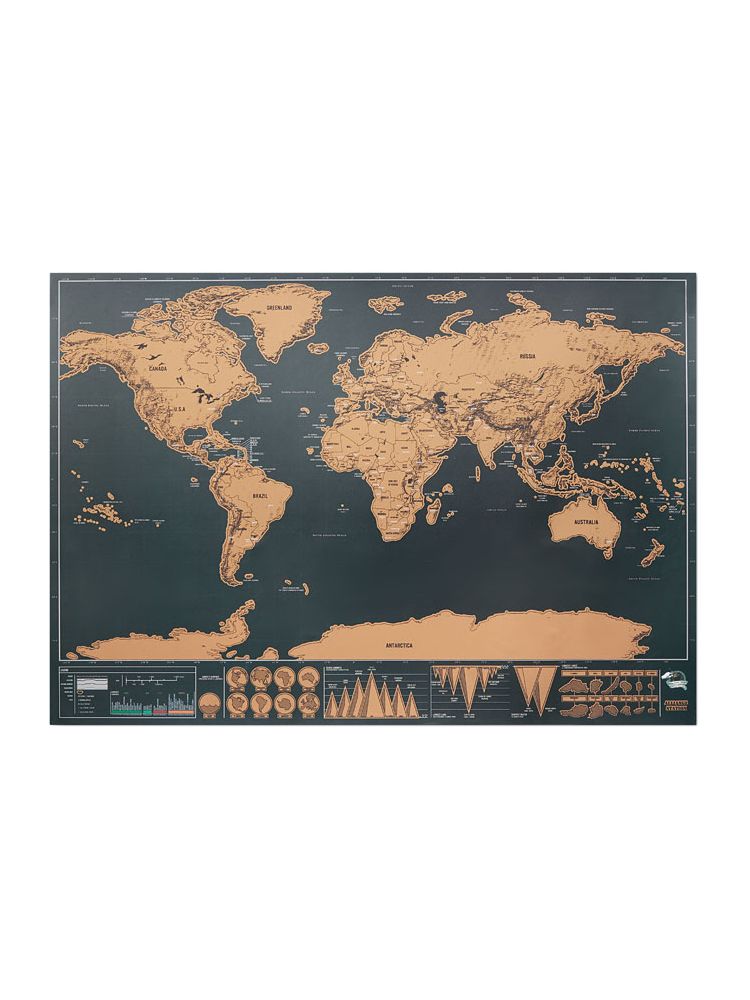 Mapa świata w formie zdrapki z chromowanego papieru. Zapakowana w papierową tubę. Wymiary mapy: 42×30 cm.