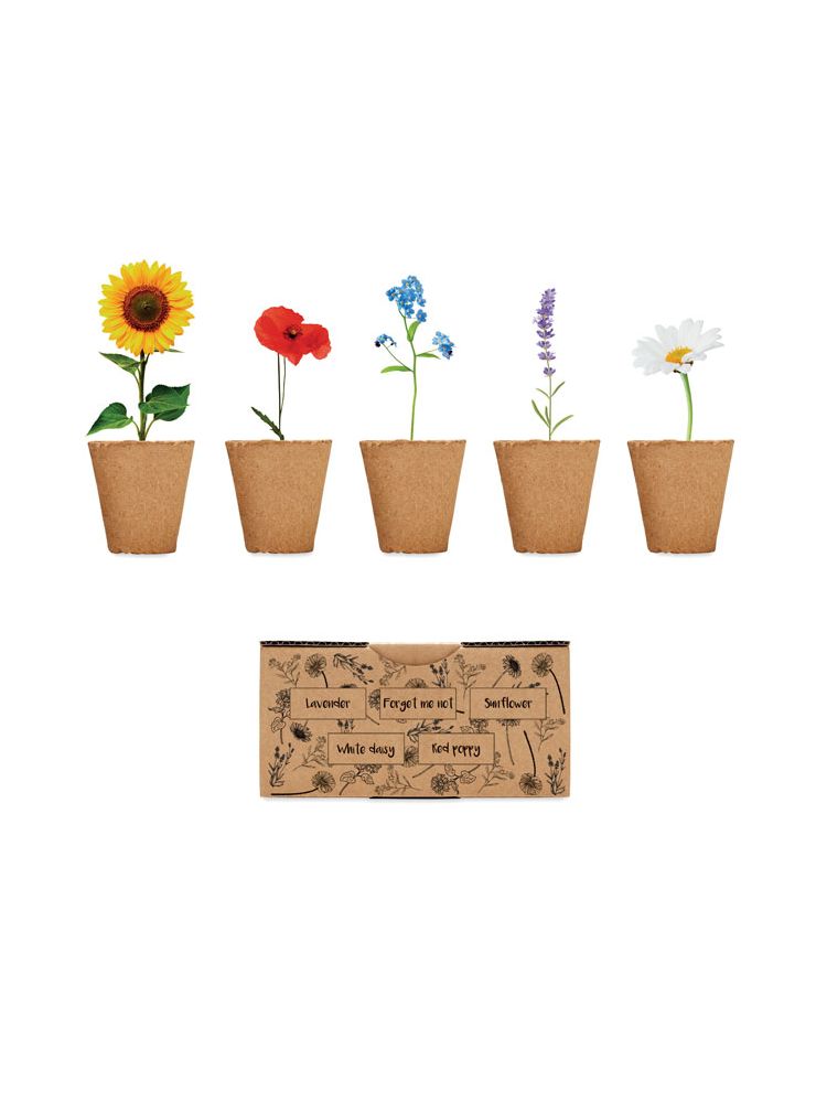 Zestaw do uprawy kwiatów. Pudełko z nasionami lawendy, niezapominajki (Helianthus debilis), słonecznika, białej stokrotki i czerwonego maku. Wyprodukowano w UE. Krążek torfowy w zestawie.