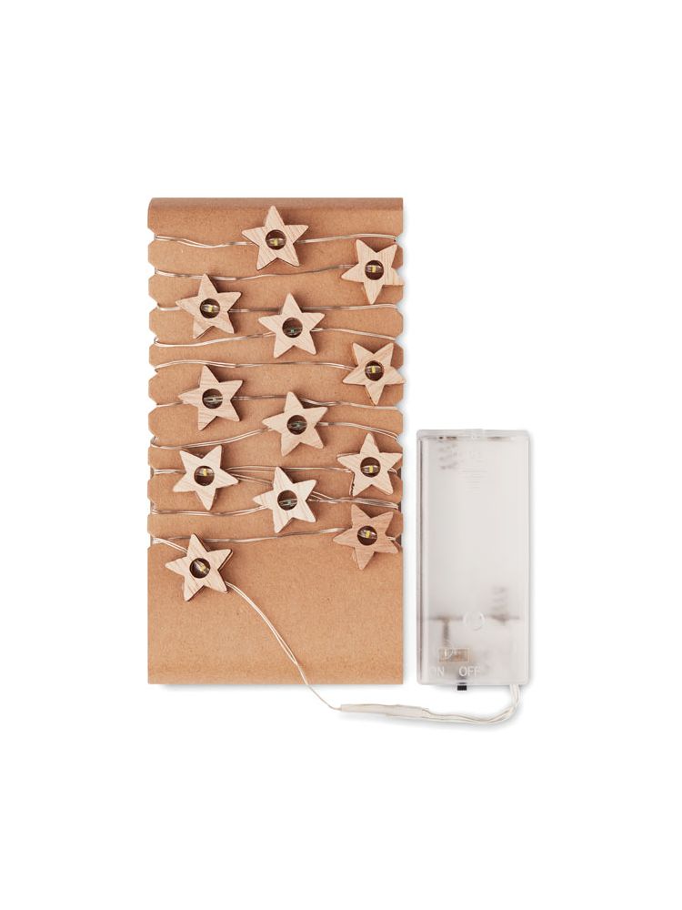 Łańcuch świetlny 20 LED, lampki w kształcie drewnianych gwiazdek. Zapakowany w kartonowe pudełko. 2 baterie AA nie dołączone. Przycisk włączania / wyłączania w obudowie baterii.