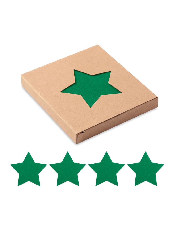 Zestaw 4 podkładek filcowych RPET w kształcie gwiazdek w pudełku z papieru kraft.