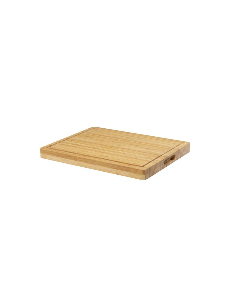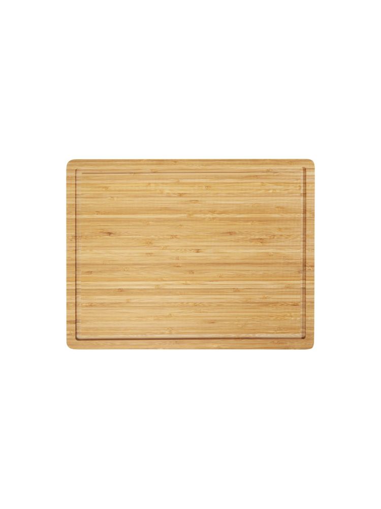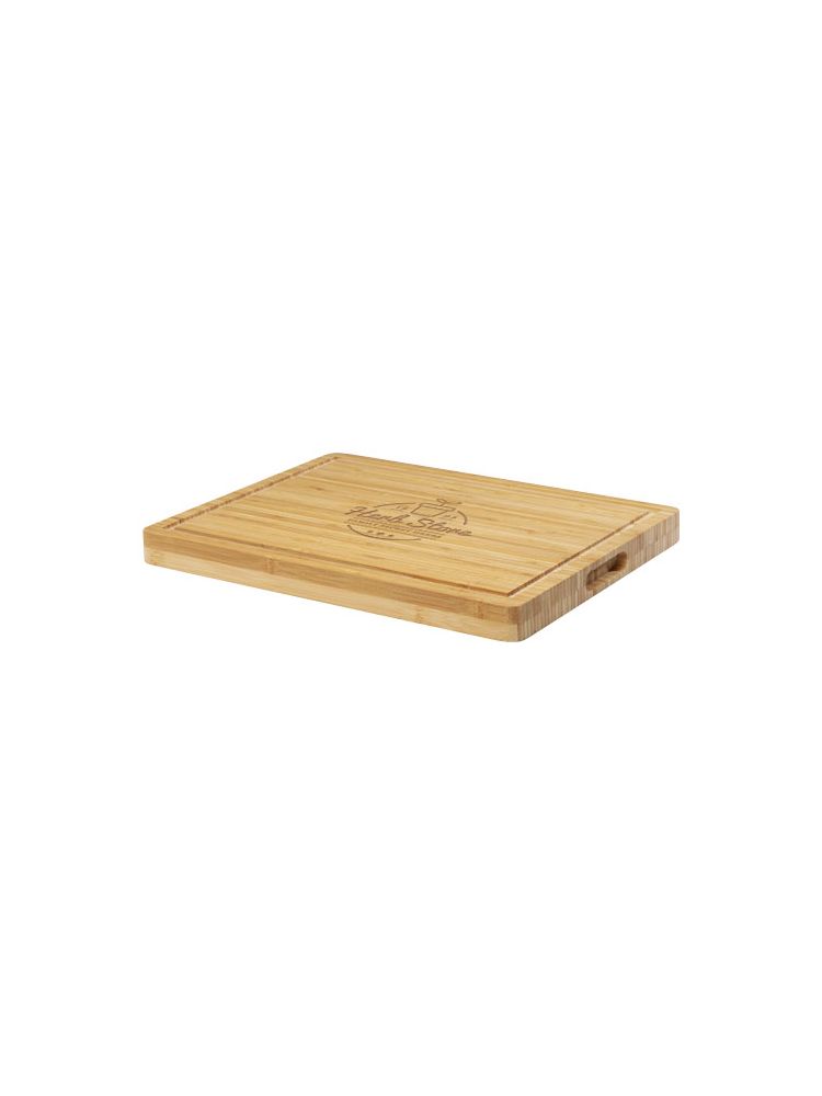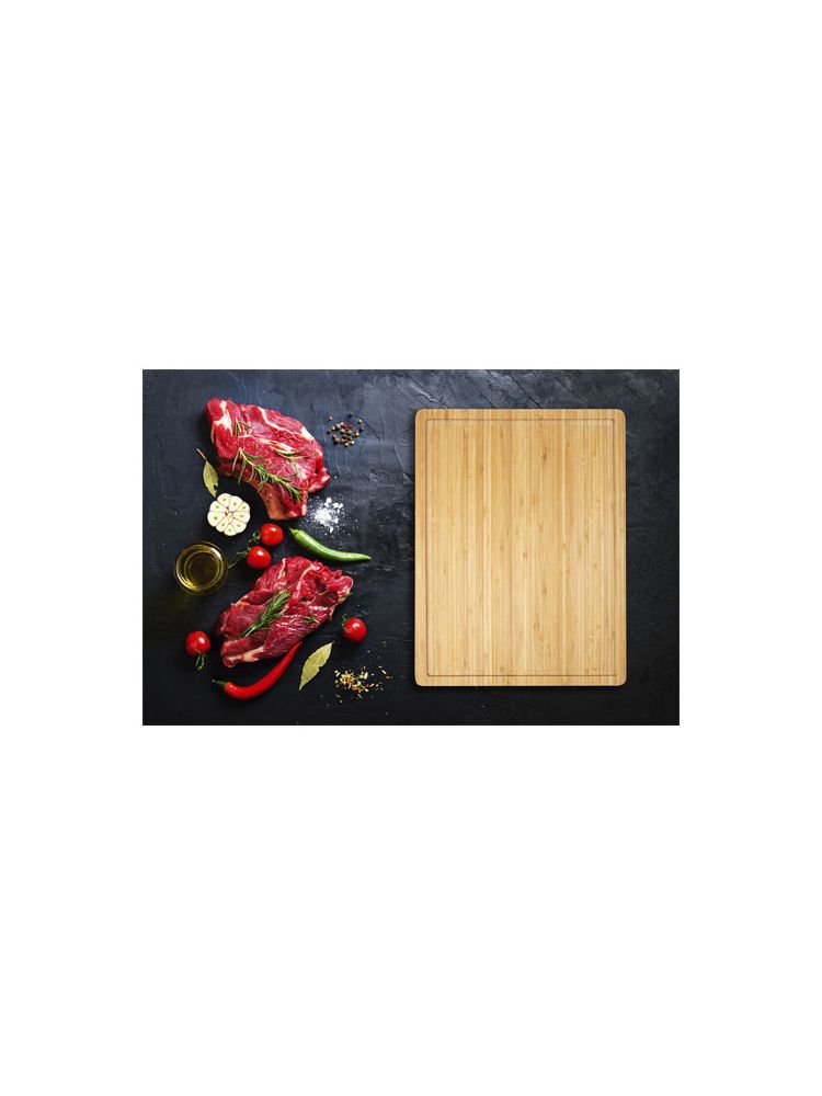 Bambusowa deska do krojenia steków z rowkiem na obwodzie, który zapobiega rozlewaniu się płynów po blacie. Deska do krojenia wykonana z bambusa, który jest pozyskiwany i produkowany zgodnie z zasadami zrównoważonego rozwoju.