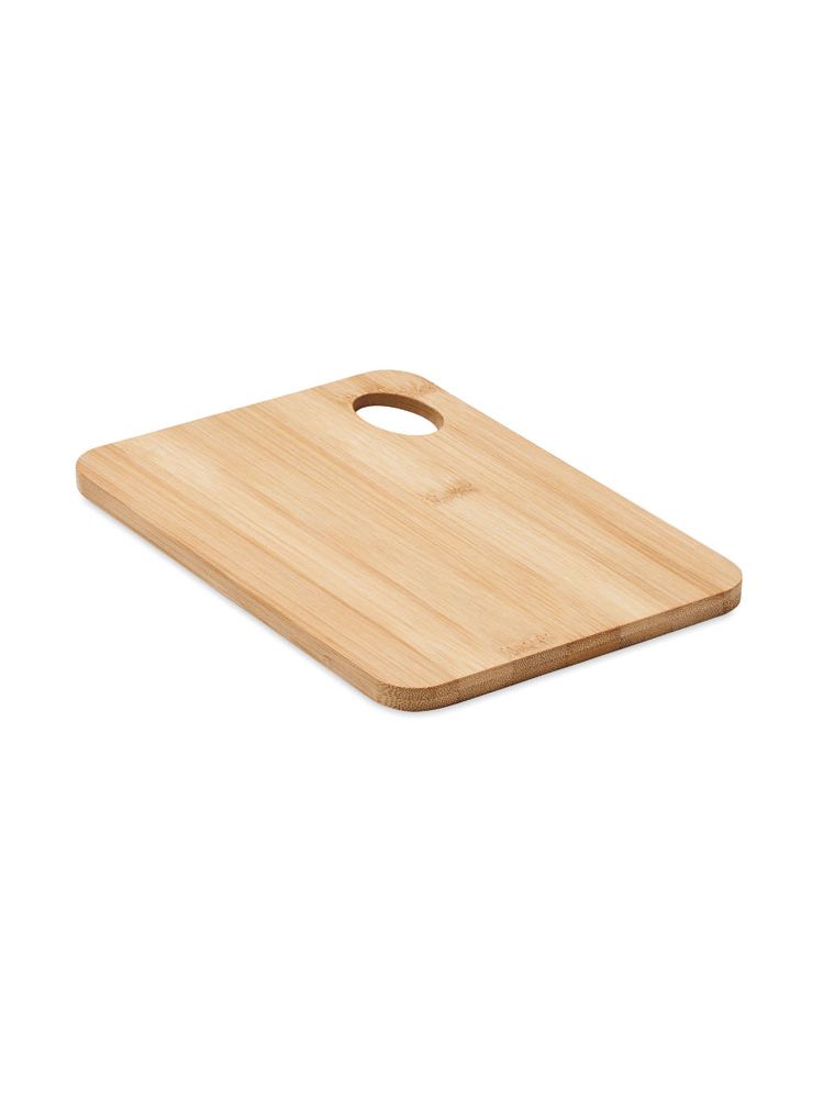 Deska do krojenia z drewna bambusowego z otworem do zawieszenia. Bambus jest produktem naturalnym, dlatego mogą wystąpić nieznaczne różnice w kolorze, wzorze i rozmiarze.