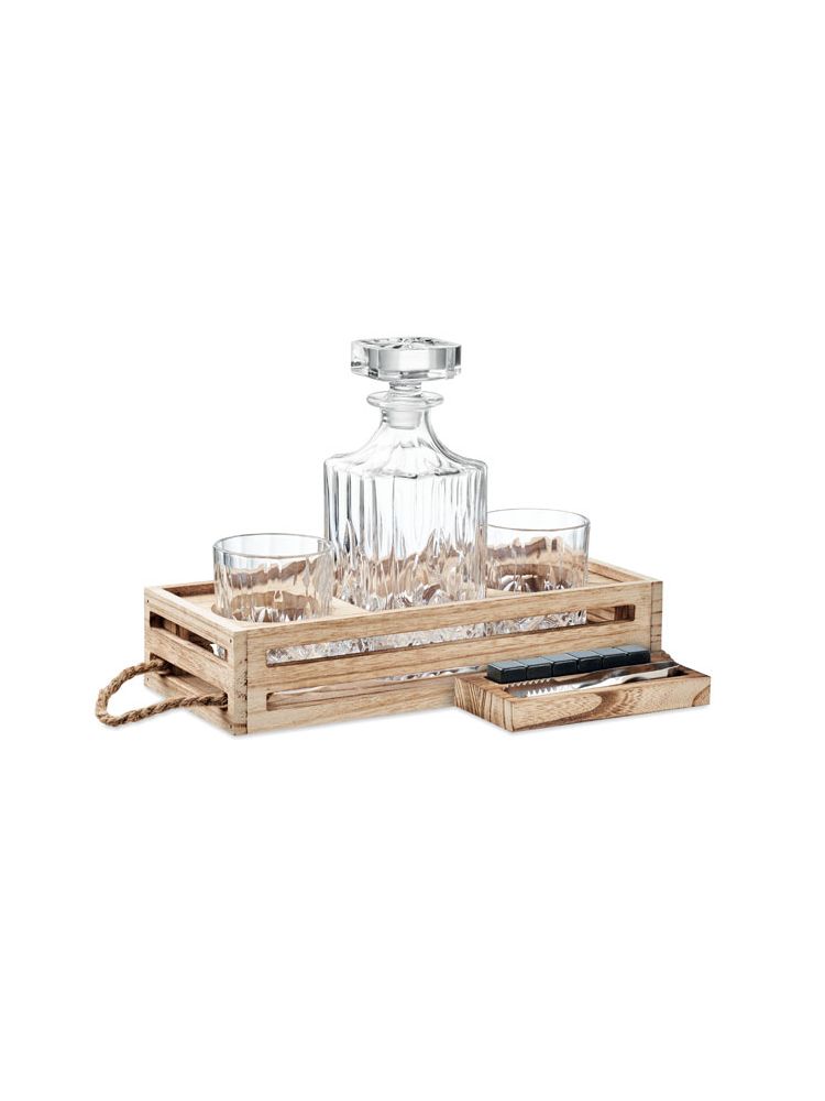 Luksusowy zestaw do whisky w drewnianej skrzynce. Zawiera szklaną karafkę (700 ml), 2 szklanki do whisky (300 ml), 6 kamiennych kostek lodu wielokrotnego użytku i szczypce.