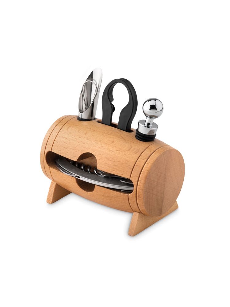 Drewniany stojak z 4 akcesoriami do wina. W tym: nóż kelnerski, korek do wina, nalewak do wina z korkiem i nóż do folii.