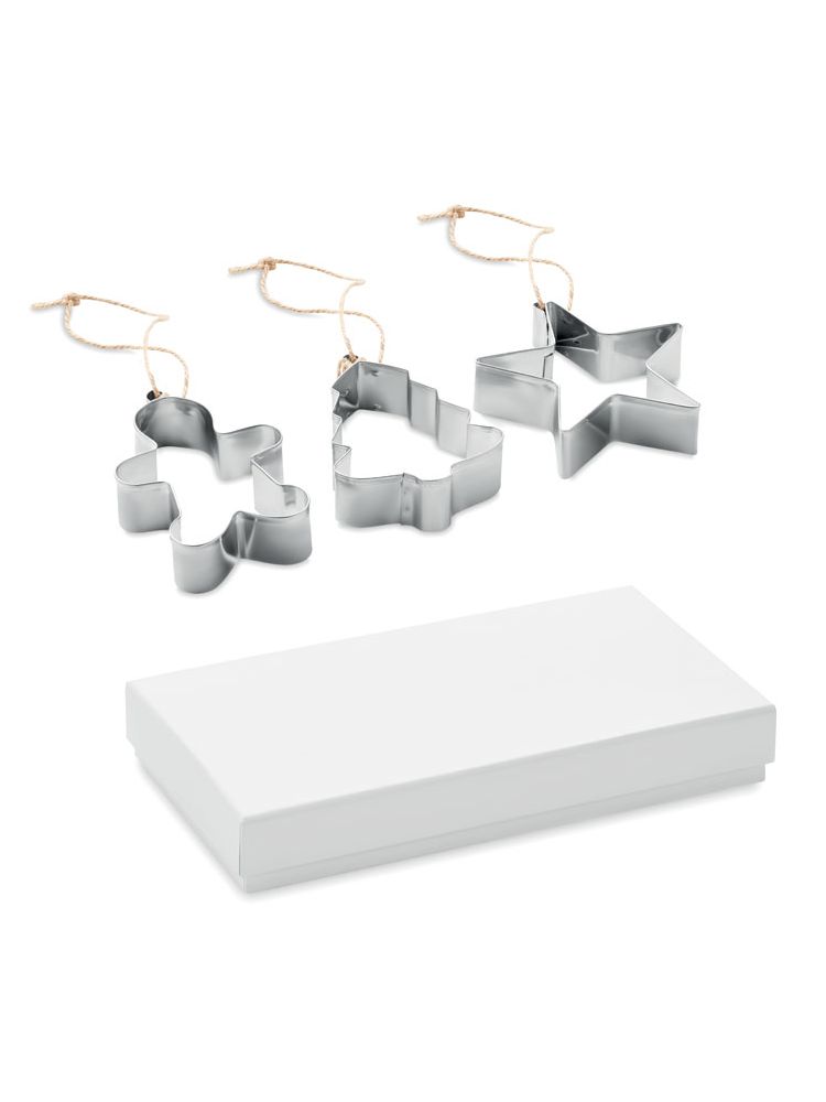 Zestaw 3 wykrawaczy do ciasteczek z nierdzewnej stali z jutowym sznurkiem. Każdy z nich może być również wykorzystany jako ozdoba choinkowa.