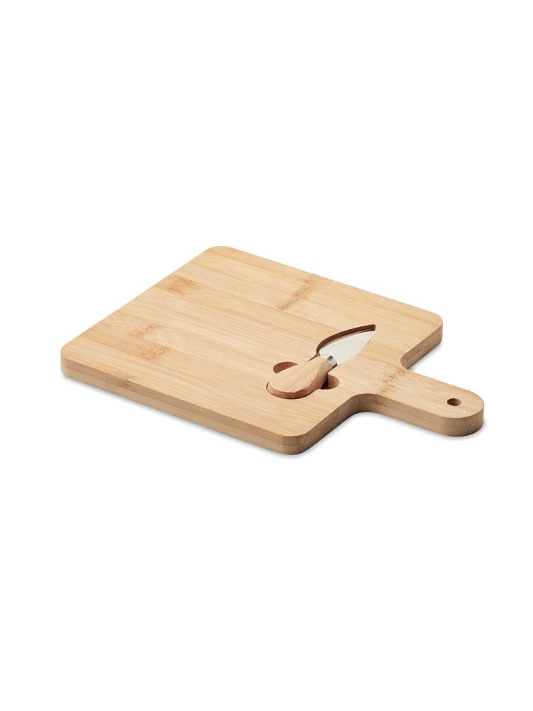 Bambusowa deska do serwowania serów z nożem. Bambus jest produktem naturalnym, dlatego mogą wystąpić nieznaczne różnice w kolorze, wzorze i rozmiarze.