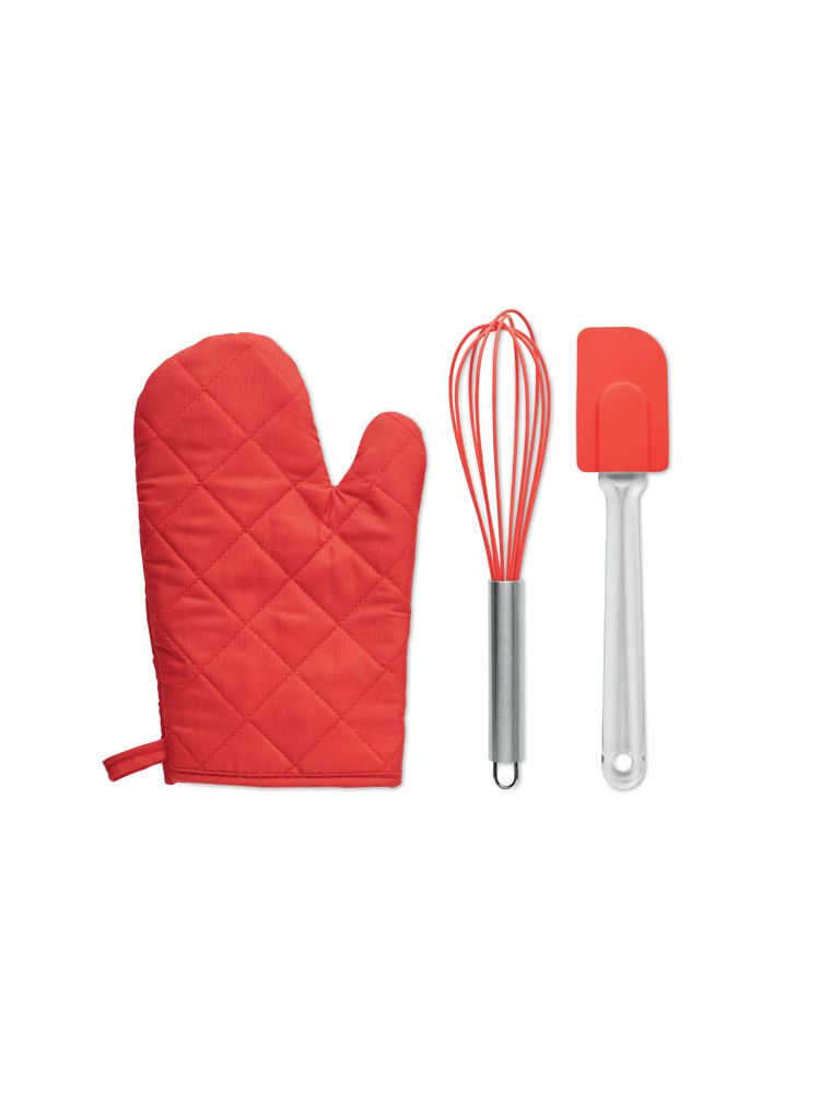 Zestaw przyborów do pieczenia. Zawiera polibawełnianą (95% poliestru i 5% bawełny) rękawicę kuchenną, trzepaczkę i silikonową szpatułkę.