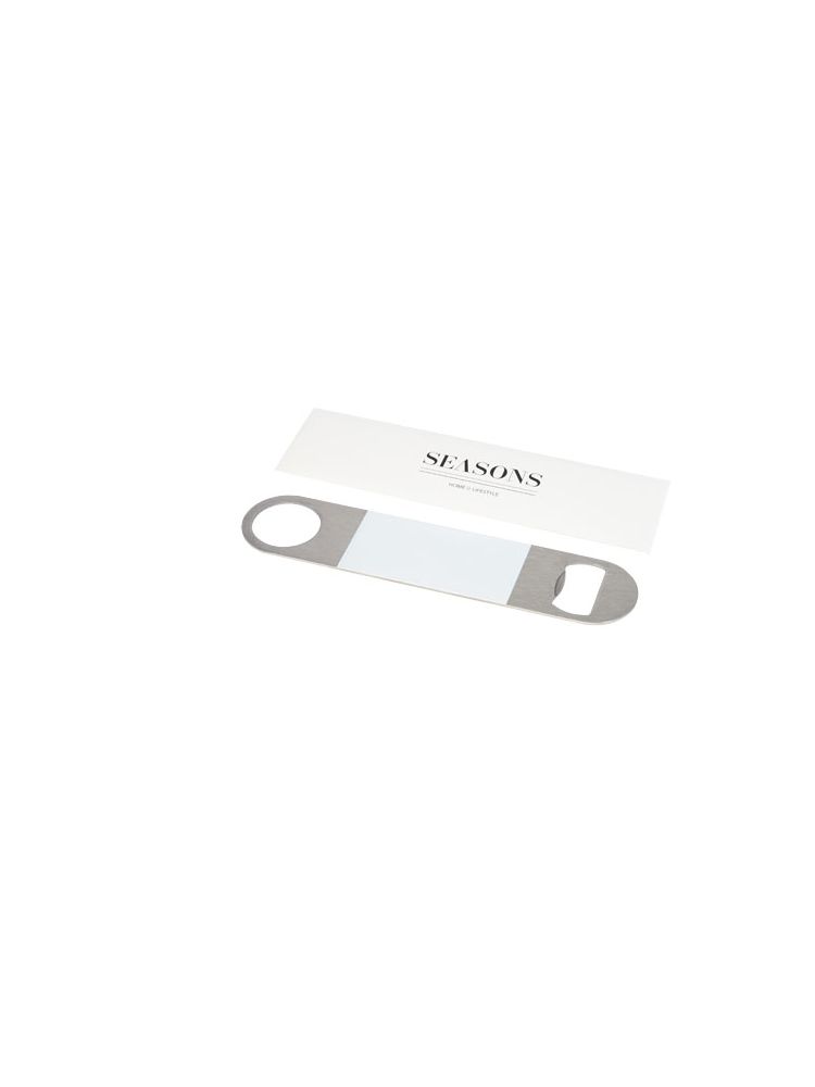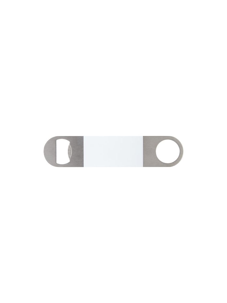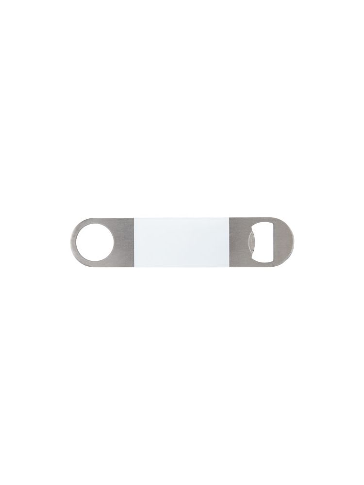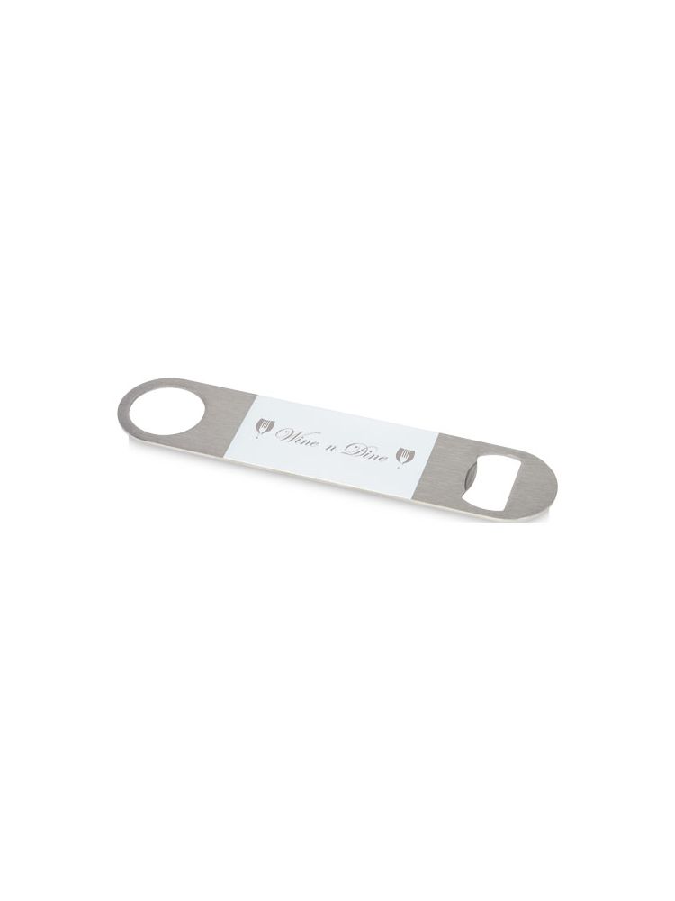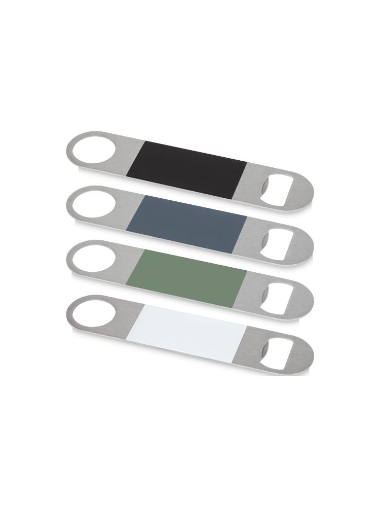 Otwieracz do butelek wykonany ze stali nierdzewnej z dużą kolorową powierzchnią na środku.