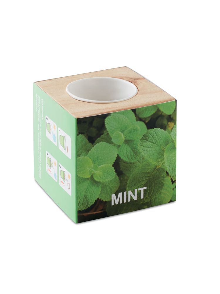 Drewniany pojemnik z ziołami. Nasiona mięty. Krążek torfowy w zestawie.