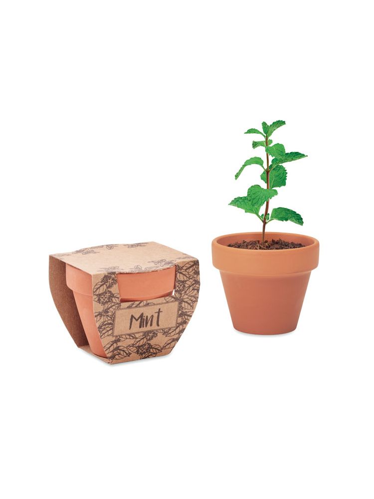 Mała gliniana doniczka z terakoty zawierająca nasiona mięty. Wyprodukowano w UE. Dołączona tabletka z glebą.