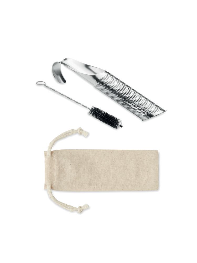 Zestaw wielokrotnego użytku z zaparzaczem do herbaty ze stali nierdzewnej w bawełnianym etui. W zestawie zaparzacz do herbaty z kompaktowym i zakrzywionym haczykiem, który umożliwia zawieszenie go nad krawędzią filiżanki lub kubka, oraz szczoteczka do czyszczenia.