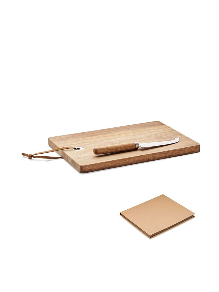 Deska do serów z drewna akacjowego z nożem. Prezentowana w kartonowym pudełku upominkowym. Drewno jest produktem naturalnym, dlatego mogą występować niewielkie różnice w kolorze i rozmiarze poszczególnych elementów, co może mieć wpływ na ostateczny efekt zdobienia.
