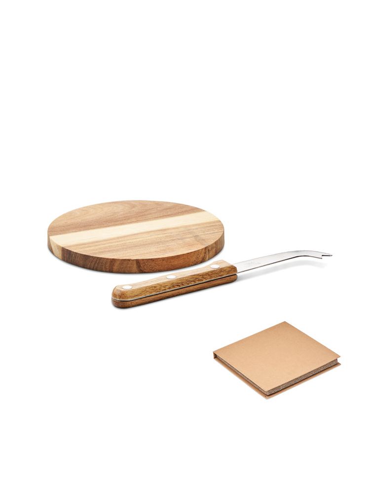 Mała deska do serów z drewna akacjowego z nożem ze stali nierdzewnej. Prezentowana w kartonowym pudełku upominkowym. Drewno jest produktem naturalnym, dlatego mogą występować niewielkie różnice w kolorze i rozmiarze poszczególnych elementów, co może mieć wpływ na ostateczny efekt zdobienia.