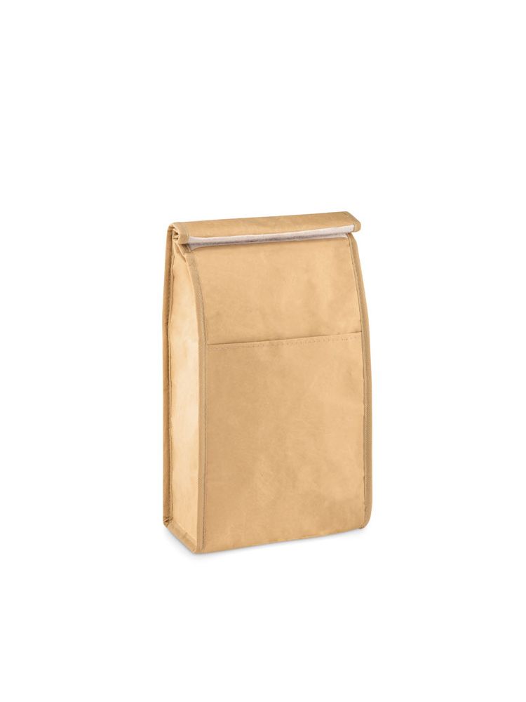 Tkana torba na lunch z papieru z recyklingu z przednią kieszenią. Materiał izolacyjny: Warstwa pianki PE. Pojemność 3 l.