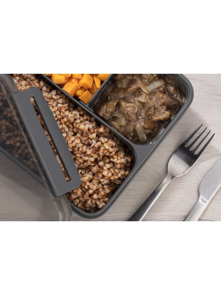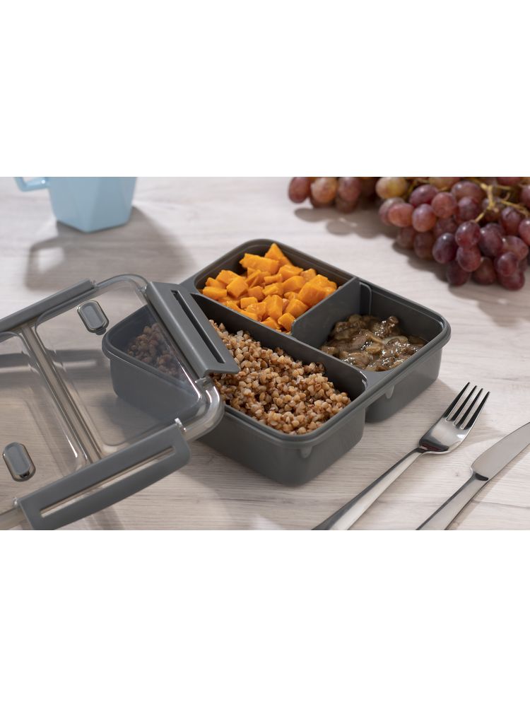 Pojemnik na lunch DUO posiada 2 główne komory i dodatkowy wyjmowany separator. Posiada uszczelkę w pokrywce. Zamykany na cztery zatrzaski. Pojemność pojemnika 1100 ml zmieści duży obiad. Wykonany z tworzywa polipropylenowego, bezpieczny w kontakcie z żywnością.